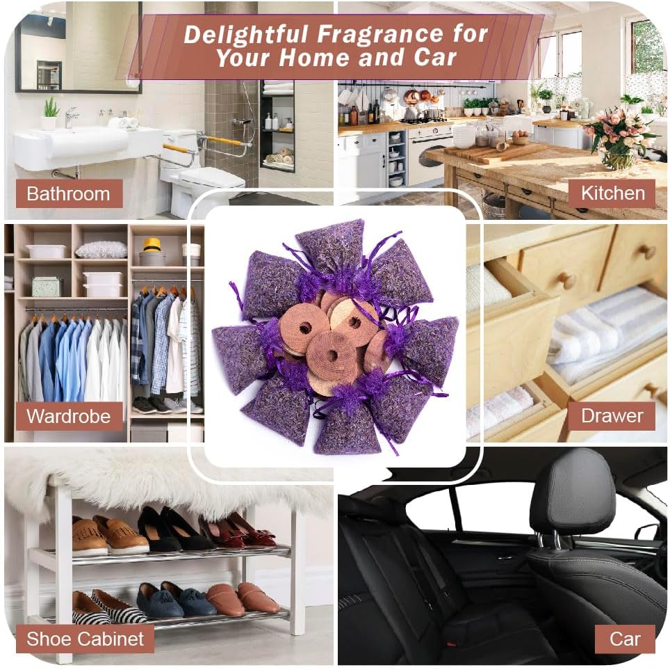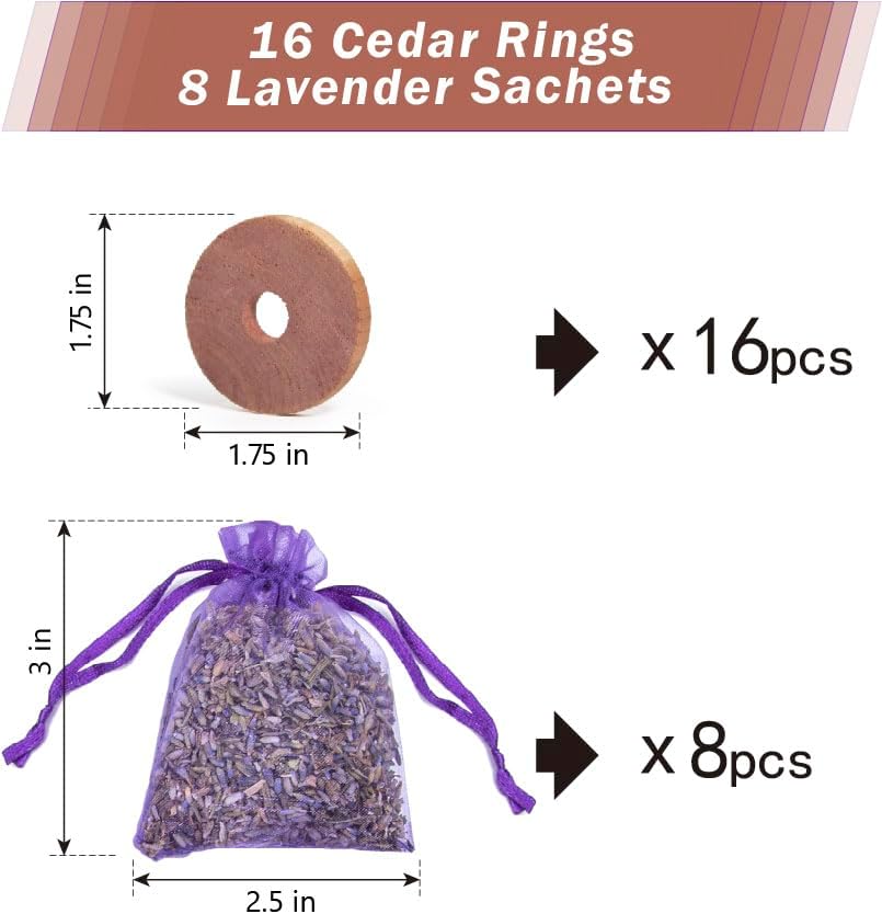 • Included: 16 small red cedar rings, and 8 lavender flower sachets. Shake the bag or squeeze the sachets a little before use for a strong lavender fragrance.