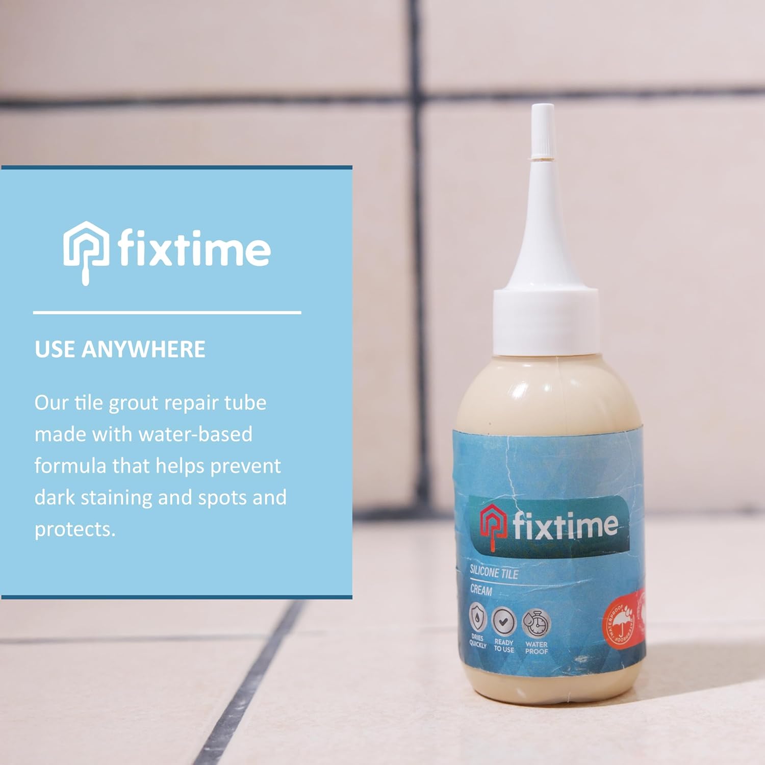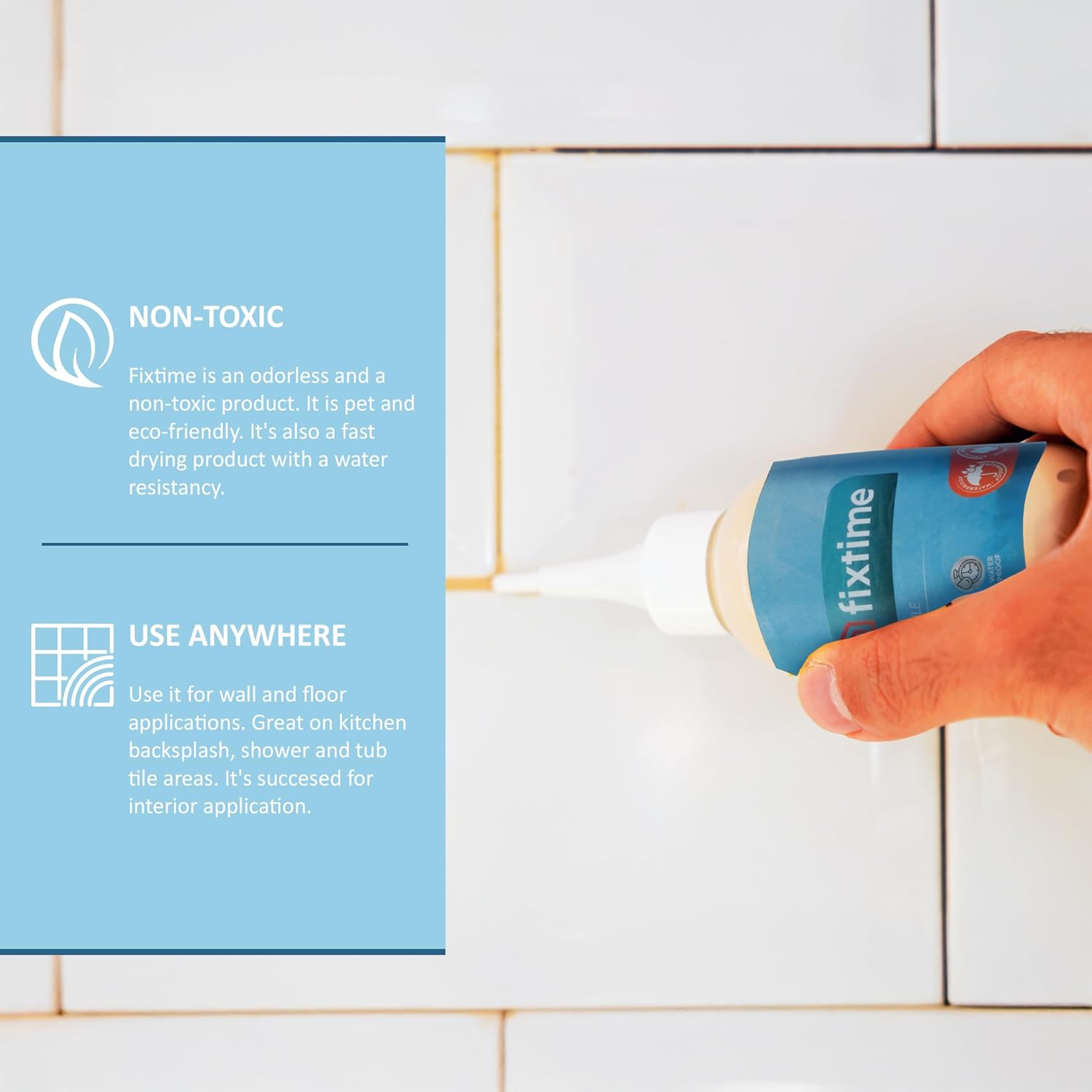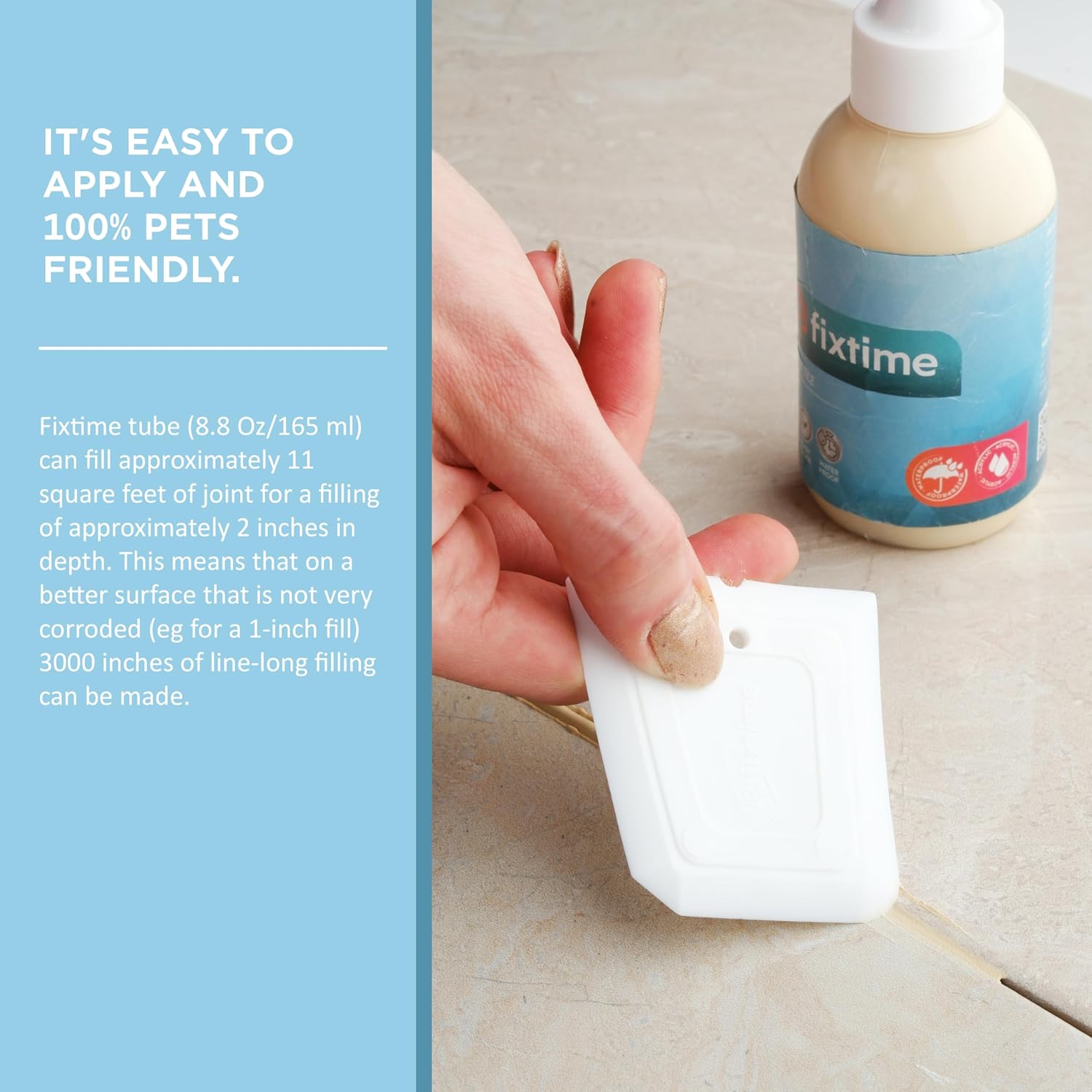 • EASY USAGE: It's fast drying formula; therefore, it's easy to apply and 100% pets friendly. Both DIY and professional friendly in only takes a warm pail of water, sponge and paper towel along with Fixtime. Always clean the area first then dry the entire area fully. Apply the desired amount of Fixtime to the intended area. Spread the Fixtime evenly by using our squege like a back side of trowel. Make sure there is no gap or bubling left throughout your grout joints.