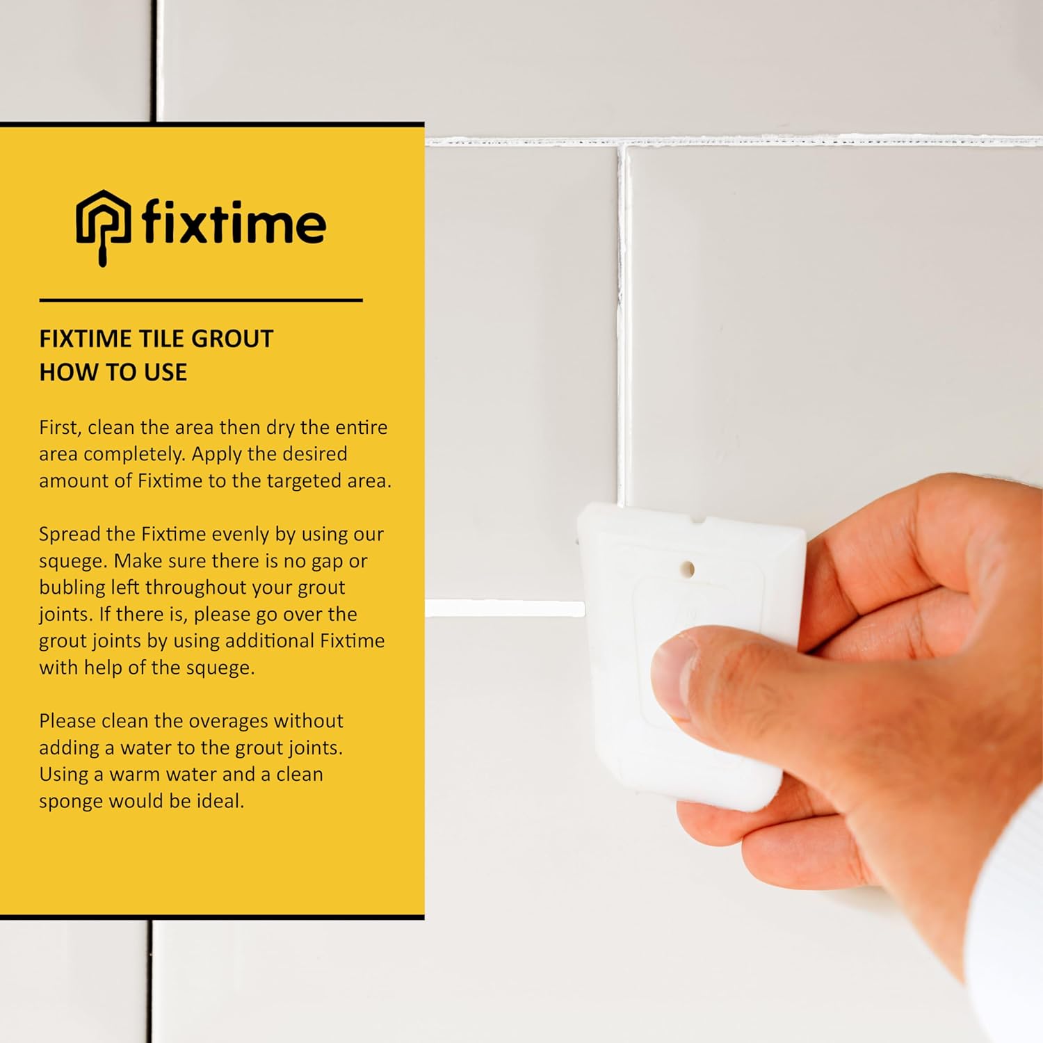 • HOW TO USE: First, clean the area then dry the entire area completely. Apply the desired amount of Fixtime to the targeted area. Spread the Fixtime evenly by using our squege. Make sure there is no gap or bubling left throughout your grout joints. If there is, please go over the grout joints by using additional Fixtime with help of the squege. Please clean the overages without adding a water to the grout joints. Using a warm water and a clean sponge would be ideal
