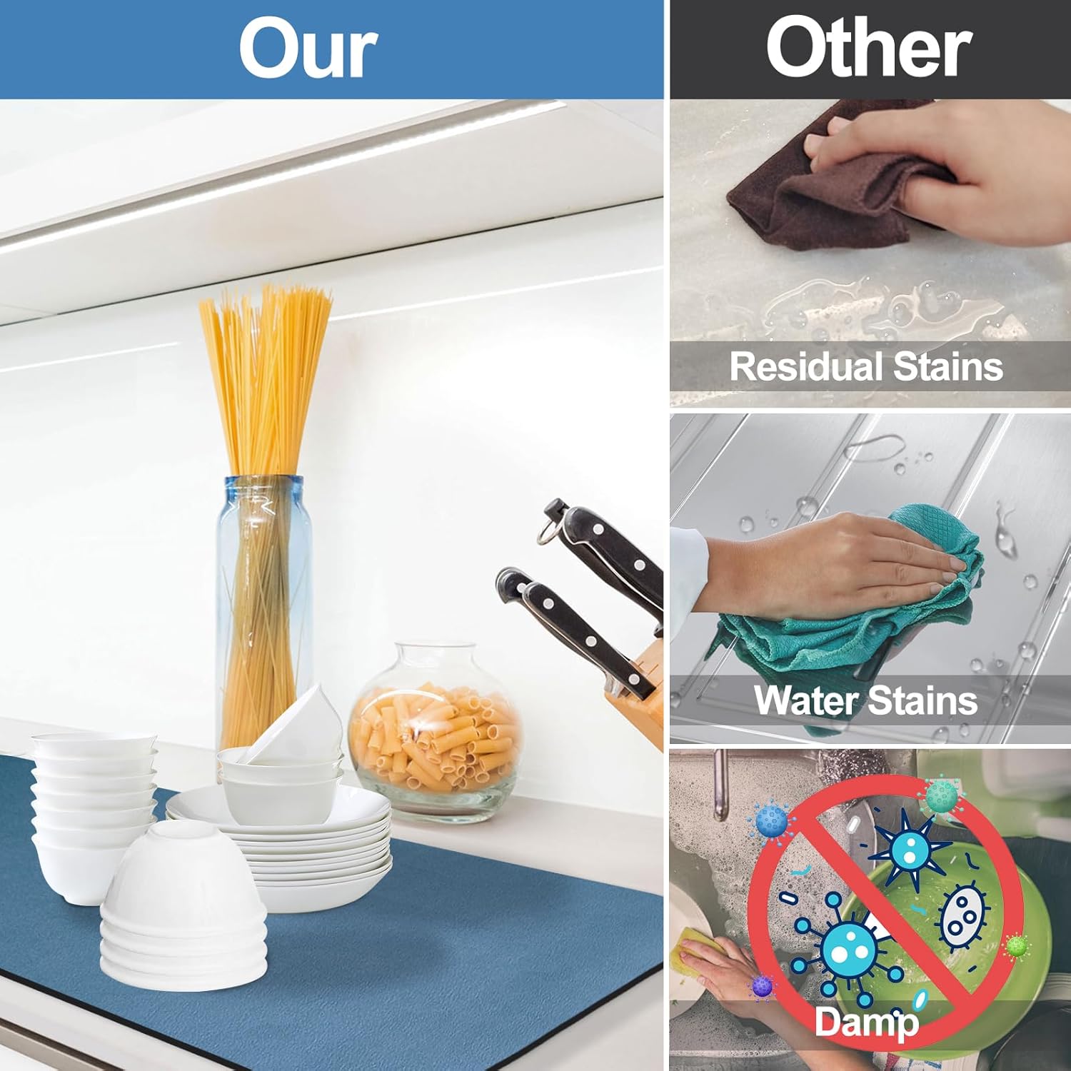 • Anti-slip: The natural rubber bottom of the drying mat has a good anti-slip effect. Prevent water from seeping from below and leave stains on the countertop, keep the kitchen countertop clean for a long time.