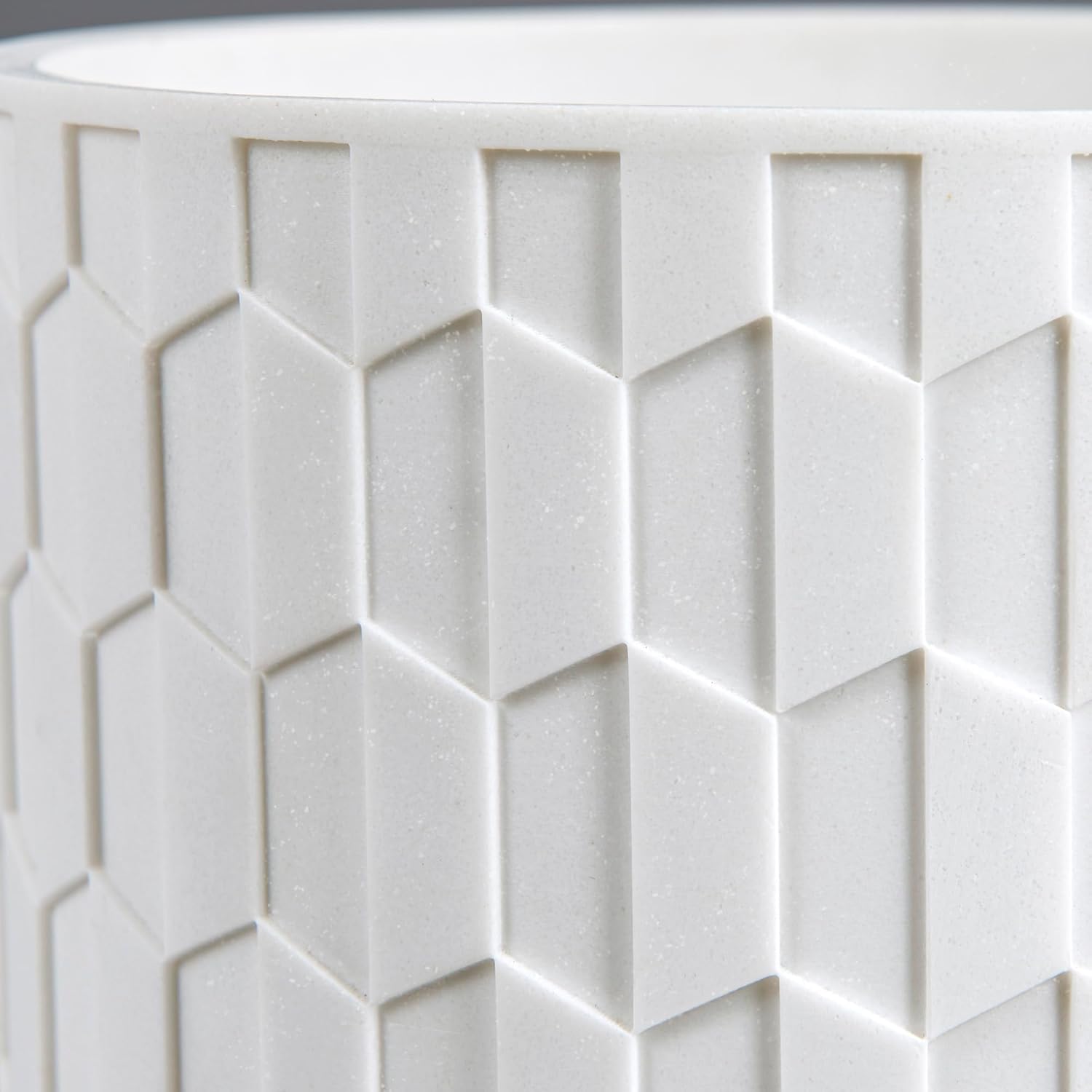 • Crisp and clean embossed geometric designed wastebasket in white with a warm wood grain base, brings sophisticated style and textural appeal to your bathroom