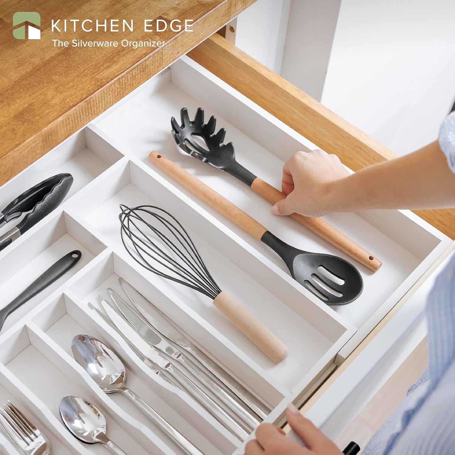 KitchenEdge Premium Silverware, Flatware and Utensil Organizer for Kitchen Drawers, Food-Safe Contract Grade, Expandable from 16 to 28 In, White Bamboo