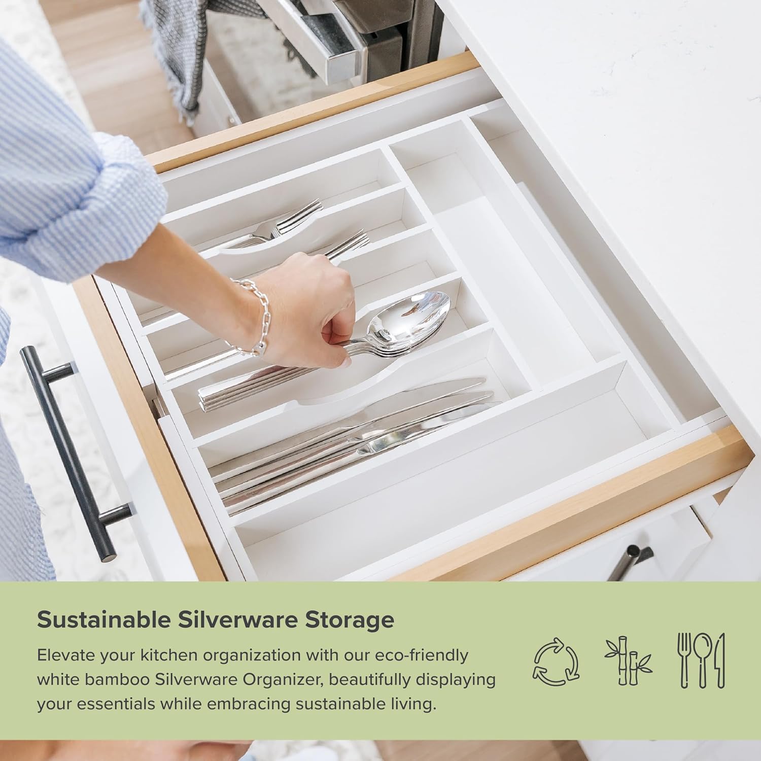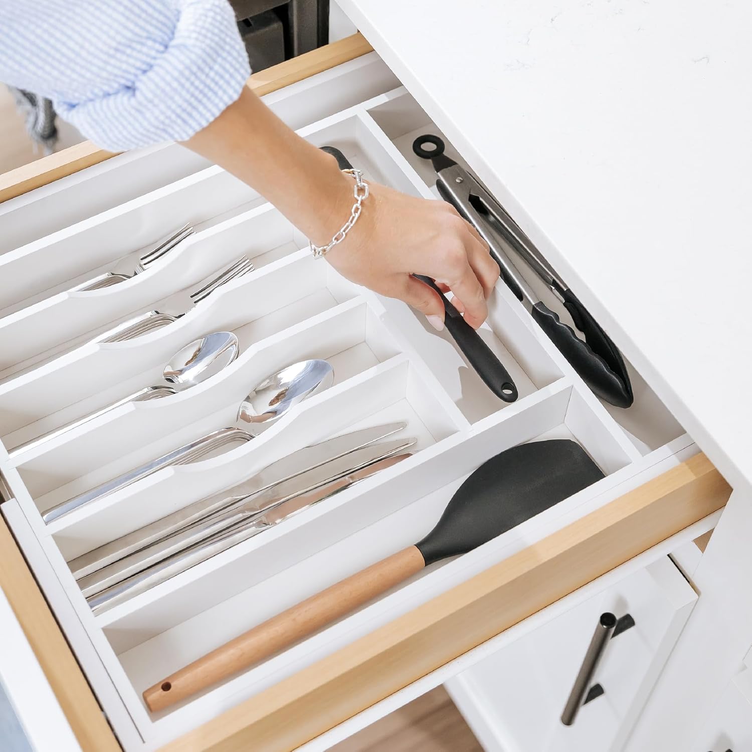 • MAXIMIZE YOUR DRAWER’S STORAGE CAPACITY: This 10-compartment (8 fixed + 2 adjustable) white organizer measures 17.4” long x 2.7” tall and expands from 14.5” to 25” wide (and any width in between). Most other bamboo organizers expand to 22” wide and are only 2” tall. It’s amazing how much storage capacity an extra 0.7” in height adds when filling your organizer full of flatware and utensils!