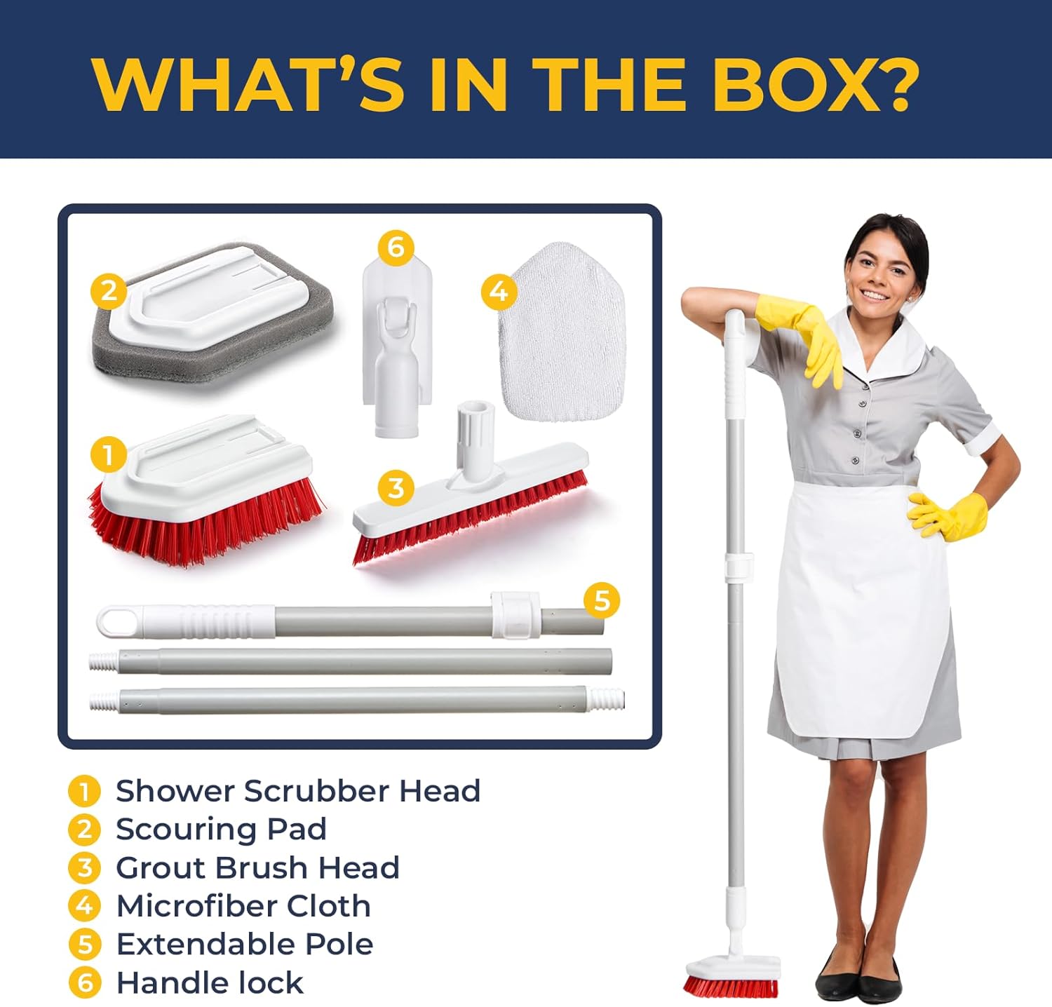 • COMPLETE CLEANING PACKAGE- Each purchase includes 3 Iron poles, 1 grout brush head, 1 tub scrubber brush head, 1 scouring pad and 1 microfiber cloth providing you with a comprehensive solution to maintaining a pristine bathroom using a reliable and efficient shower and tile cleaning brush
