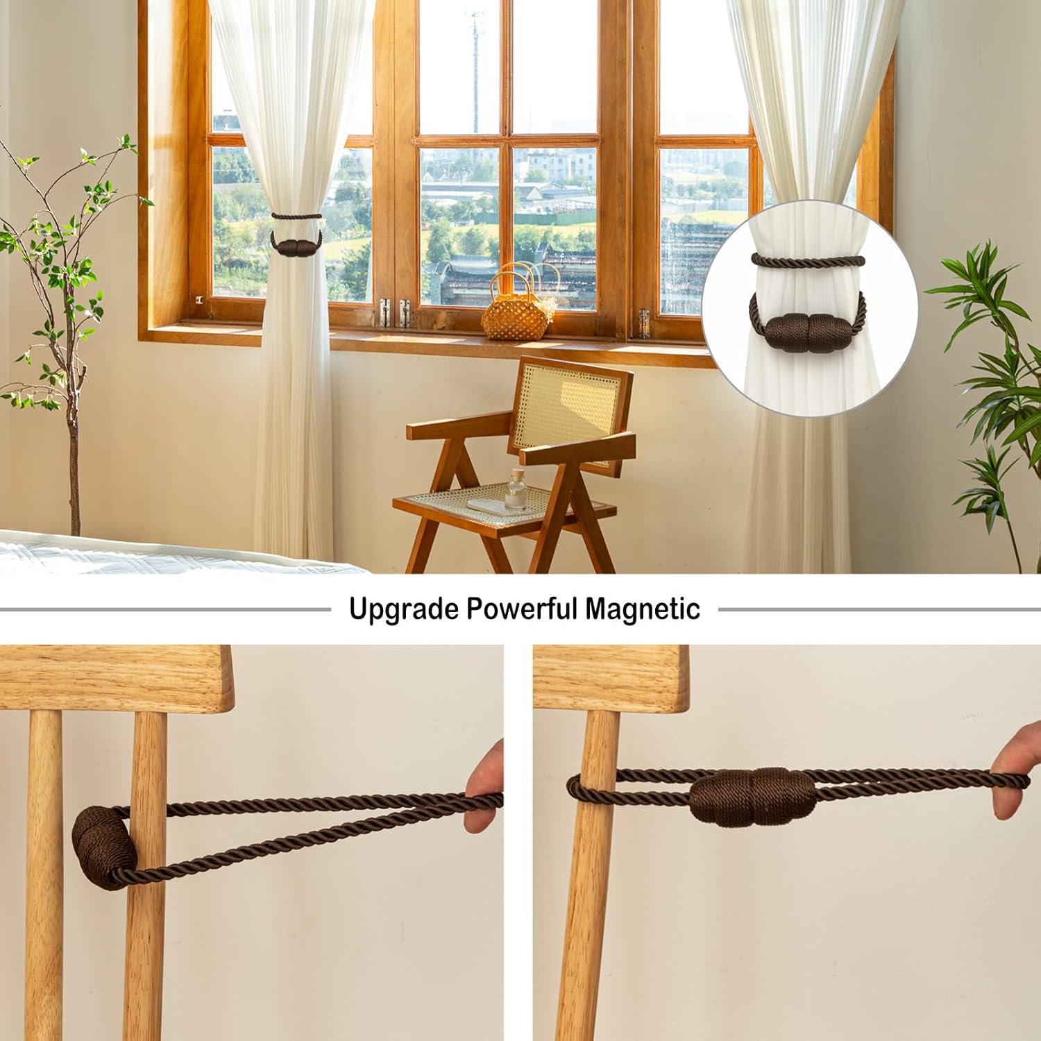Magnetic Curtain Tiebacks Rope Curtain Tie Backs for Curtains 2 Pack Curtain Holders for Drapes Decorative Window Curtain Holdbacks, Coffee