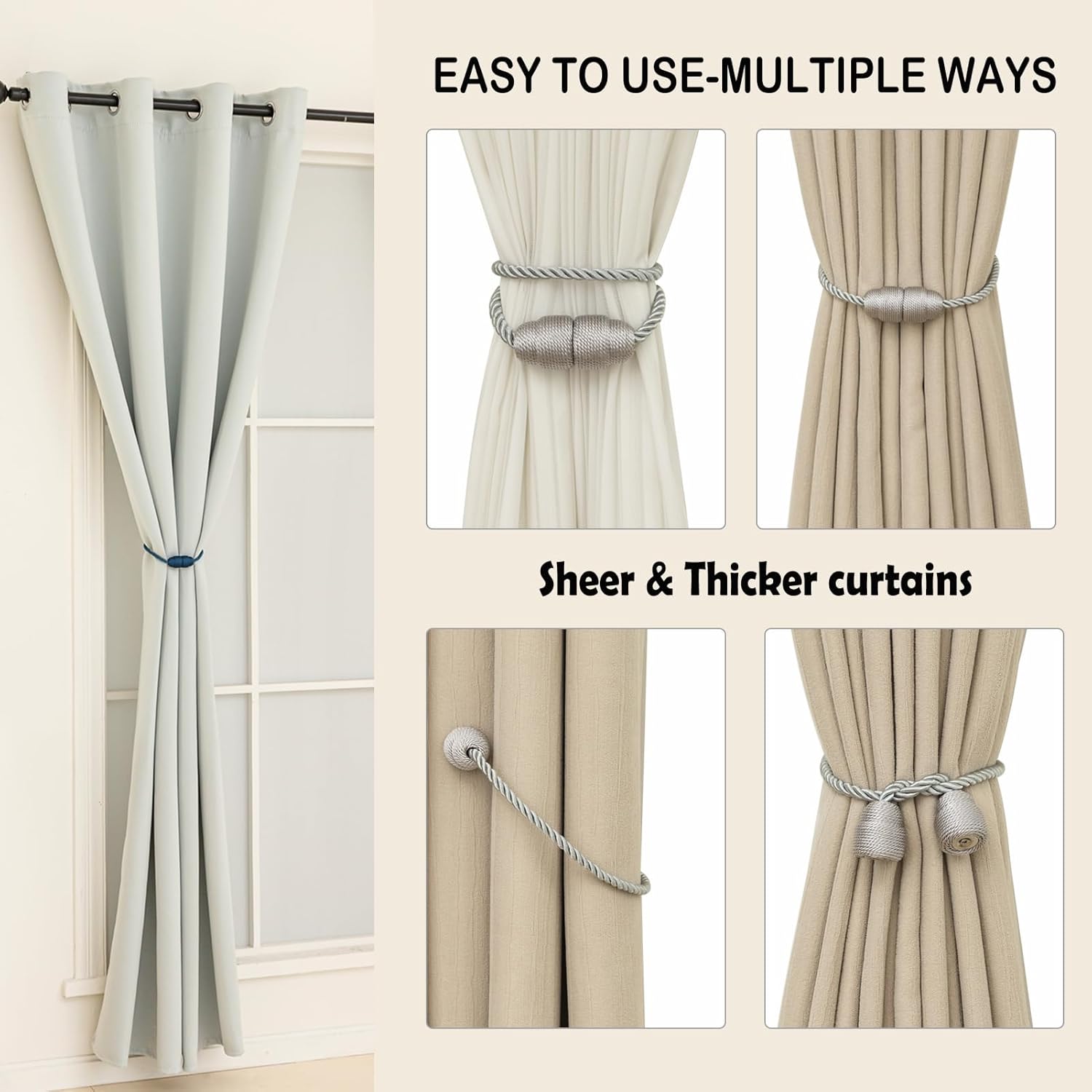 • Simple and easy to use: Our curtain holdbacks have a simple design and are very simple to install and use. Just attach them to the curtains and adjust them as needed. They also untie easily so you can open or close the curtains at any time. Whether you need to increase the practicality of your curtains or enhance the beauty of your room with decorative accents.