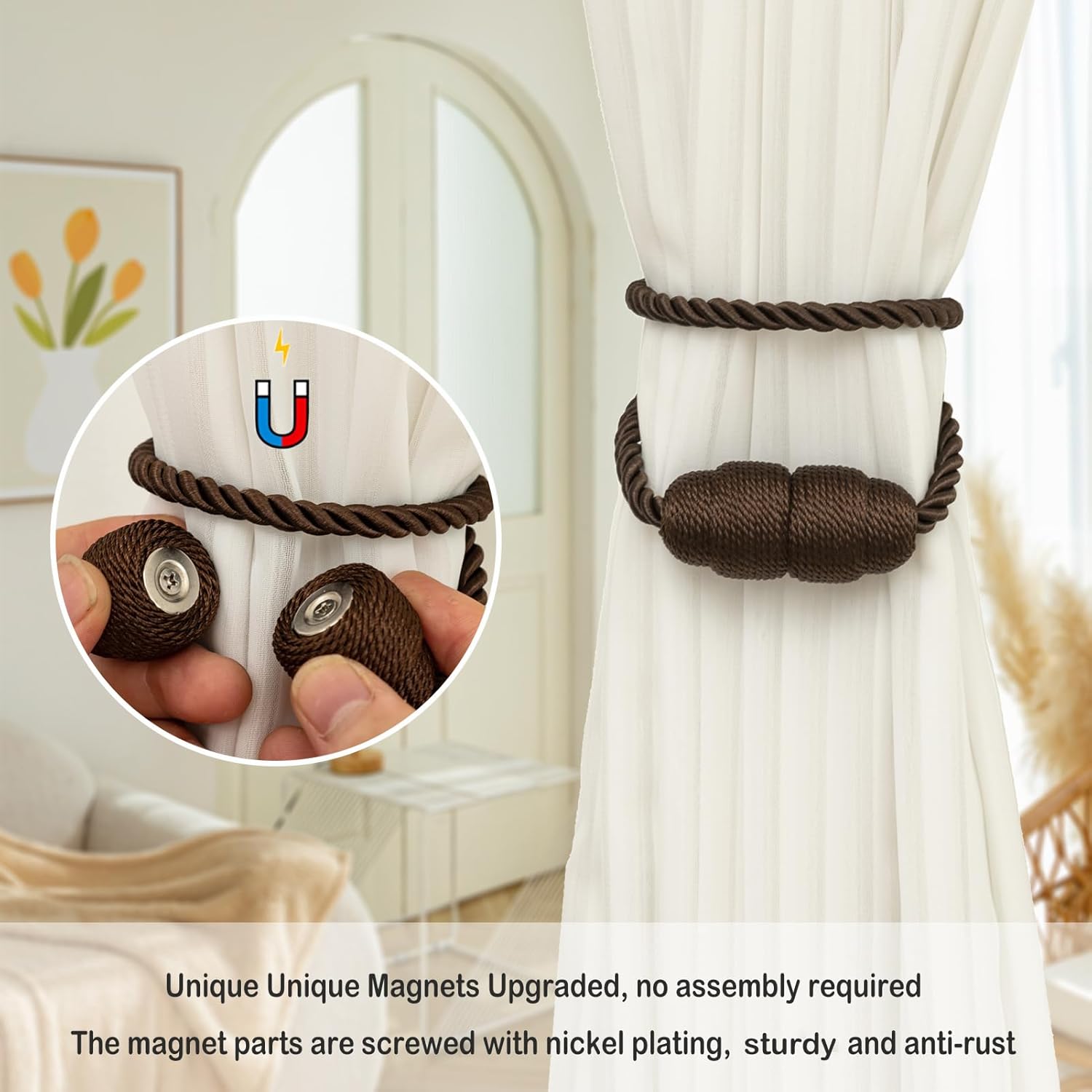 Magnetic Curtain Tiebacks Rope Tie Backs 4 Pack Decorative Window Holdbacks, Coffee