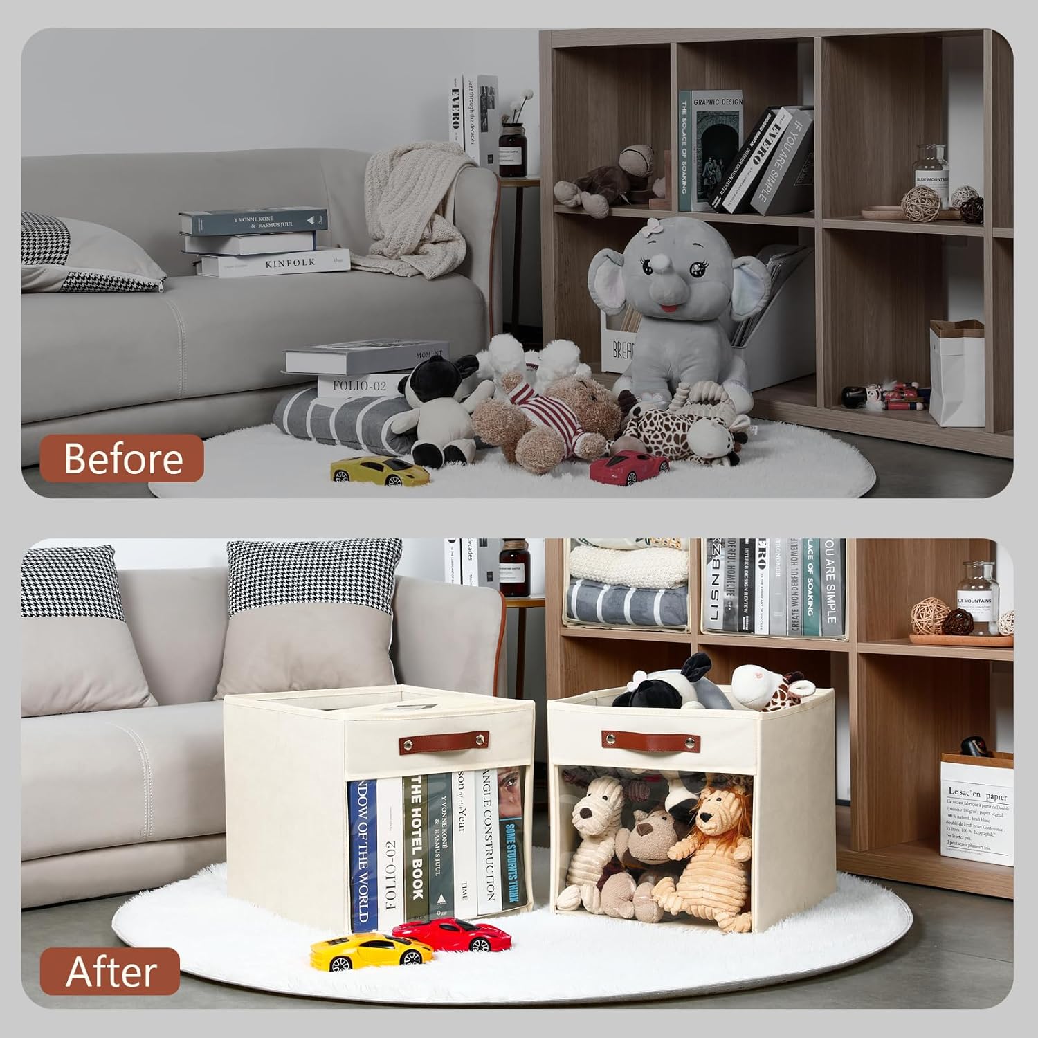 • 【Clear Cube Storage Bins】We have made an upgrade to the cube storage baskets for shelves by incorporating a clear window design. This feature enables you to easily and precisely view the cubby storage cubes organizer shelves stored inside. There will be no need to dig through the contents anymore.This will improve the efficiency of your search, which in turn will help you save valuable time and effort.