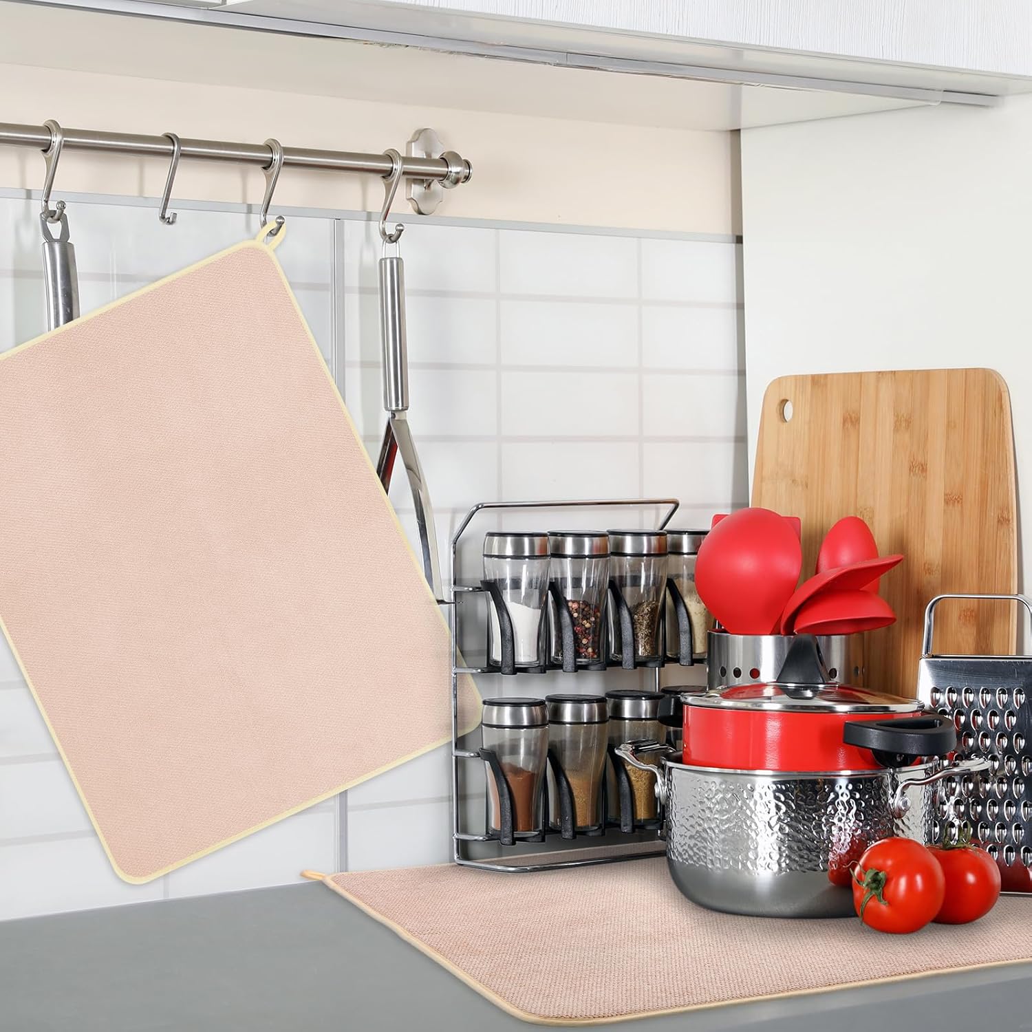• Reliable Material and Attractive Design: get the ideal balance of functionality and style with our kitchen drying mats for dishes; Made from microfiber, these mats exhibit impressive water absorbent property, ensuring a dry, clean countertop; Their pleasing beige color will effortlessly blend with most kitchen interior, enhancing its aesthetics