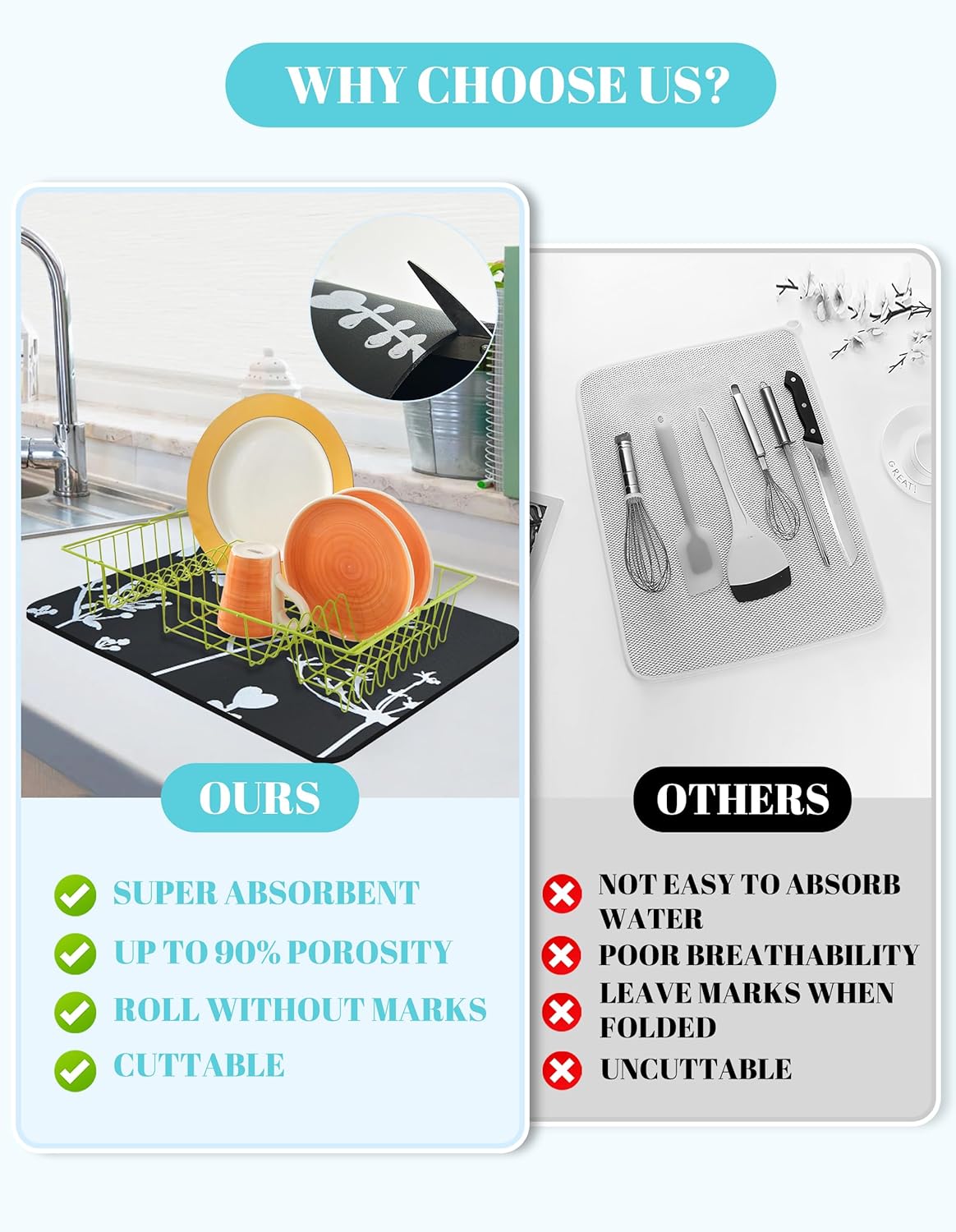 • SUPER ABSORBENT: The microfiber tableware dish drying mat is made of high-absorbent nanomaterials. Special PU surface hide coffee stains, milk stains and any other dark messy stains well. In addition, the drying mat is thick enough to better protect countertops, tableware, and glassware from damage and contamination.