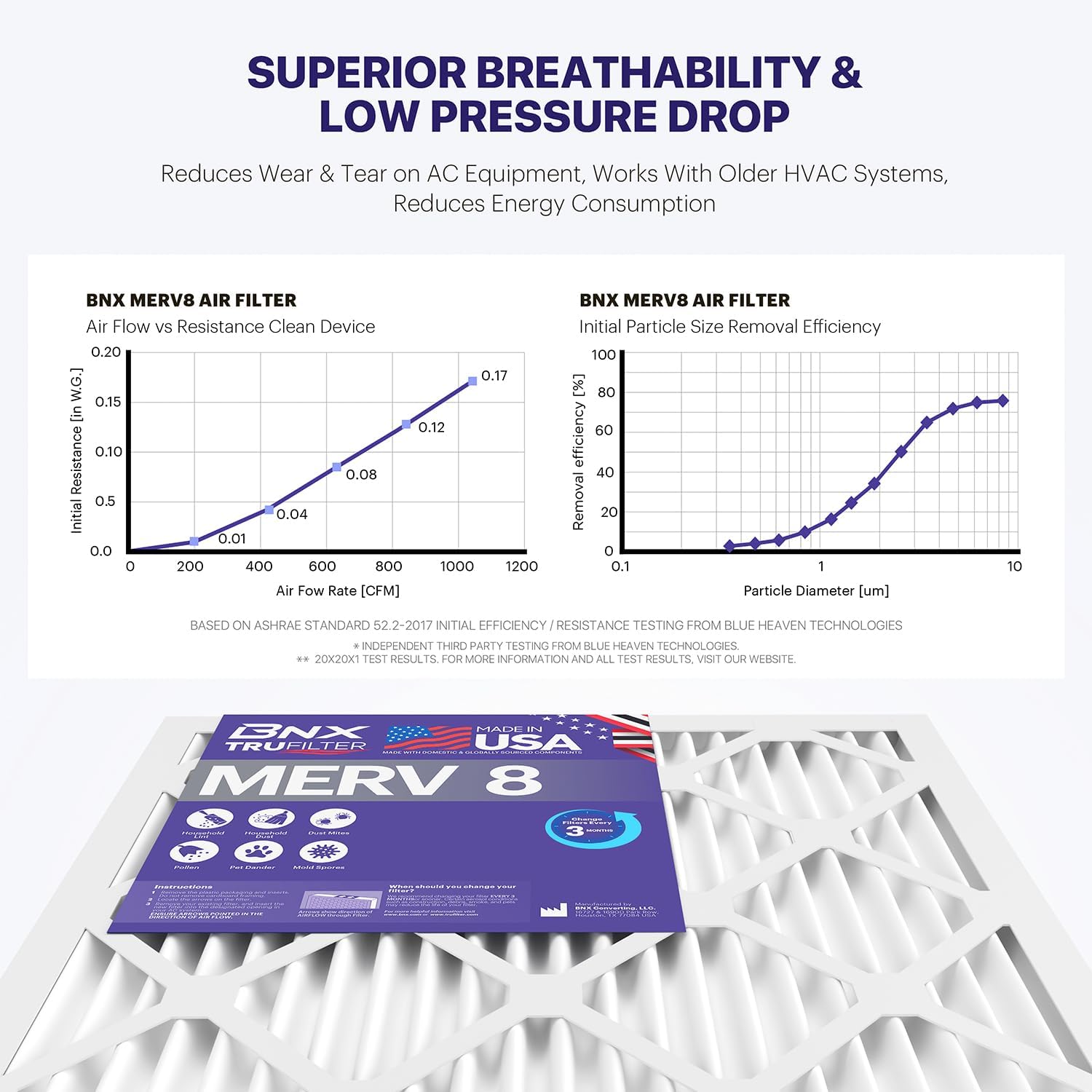 • SUPERIOR PERFORMANCE - The BNX MERV 8 100% synthetic air filter media outperforms standard fiberglass filters and adopts the latest in electrostatic filtration technology to allow for industry leading superior low air flow resistance while maintaining the highest grade level of filtration.