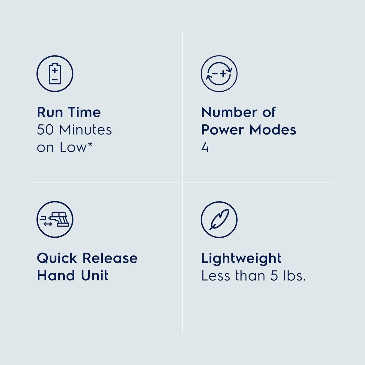 • Versatile Design: Weighing less than 5 lbs., this lightweight stick vacuum offers easy maneuverability with a full tilt design for effortless clean-up under furniture and a quick release hand unit for smaller messes