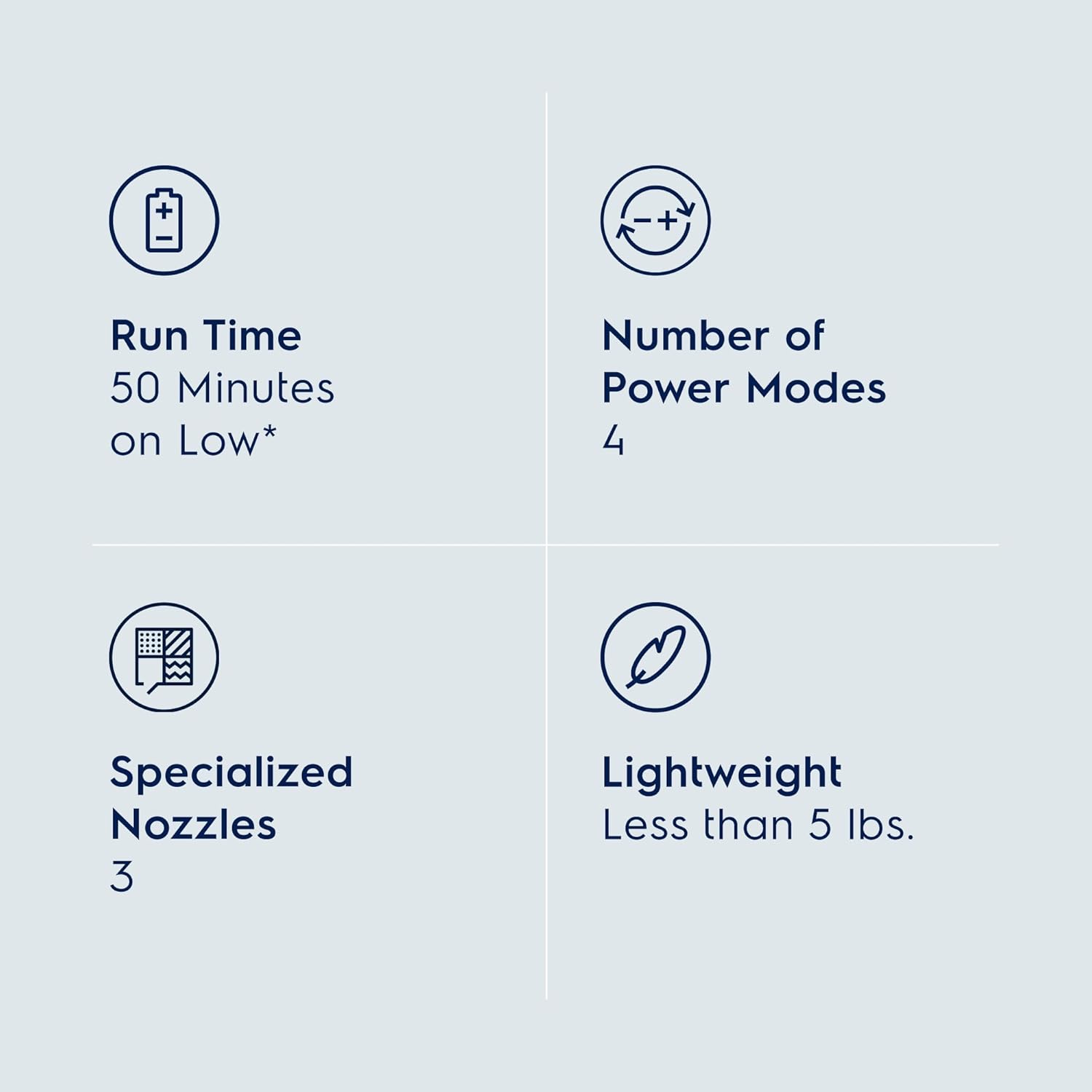 • Long-Lasting Cordless Power: Enjoy up to 50 minutes** of run time; Set your vacuum to Auto Mode, which automatically adapts the vacuum's suction power depending on the floor type