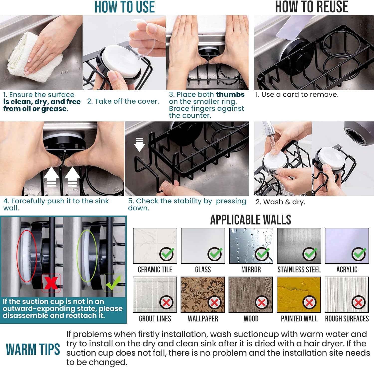 • [1 Second Installation & Removable]: Simply choose a smooth and dry surface without any grout, take off the protective cover and push the board "PUSH" hard until you hear "PUFF", ONE second to complete the installation.. No screws, no nails, no glue, no tools. The kitchen sink caddy can be re-positioned many times and removed without leaving residues (If problems when firstly installation, wash suction cup with warm water and try to install on the dry and clean sink after it is dried with a hair dryer)