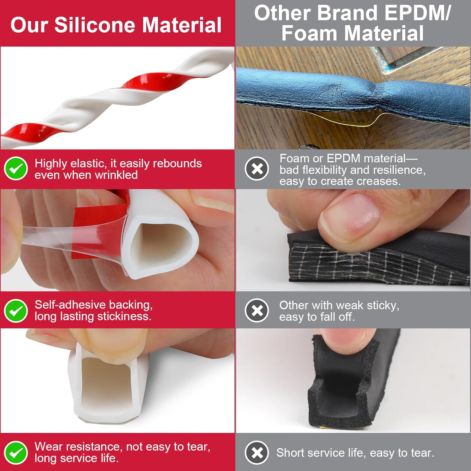 • High-Quality Silicone Material: Our door seal strip is made from premium silicone, offering greater durability and flexibility compared to foam or EPDM rubber strips. Silicone withstands temperatures up to 200°C, remains flexible in cold conditions, and resists cracking, ensuring long-lasting durability