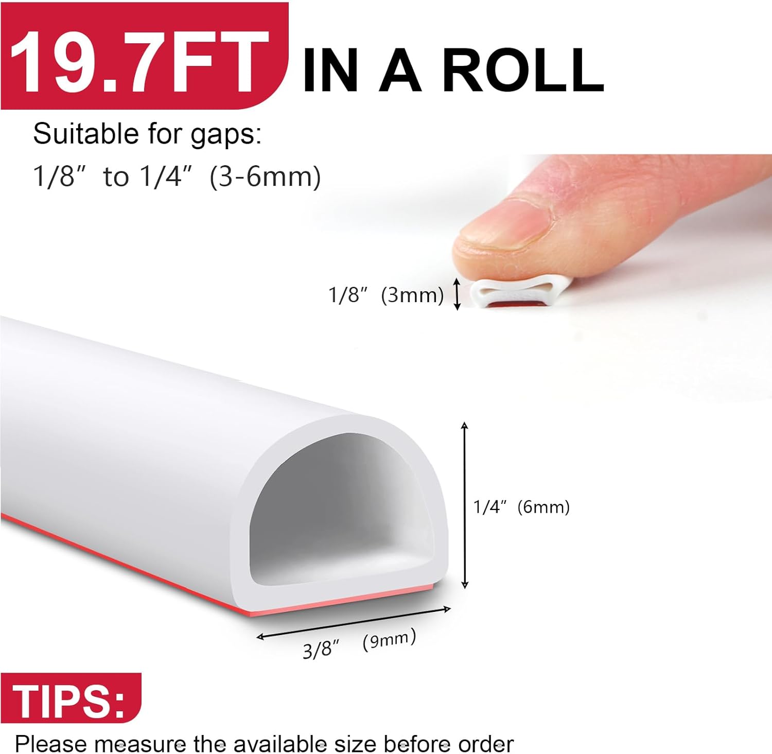 • Package Includes: The door weather stripping is 19.7 feet (6 meters) long, with a width of 3/8 inch (9mm) and a thickness of 1/4 inch (6mm). It is designed to fit gaps from 1/8 to 1/4 inch (3 to 6mm). Please measure the gap width before purchasing