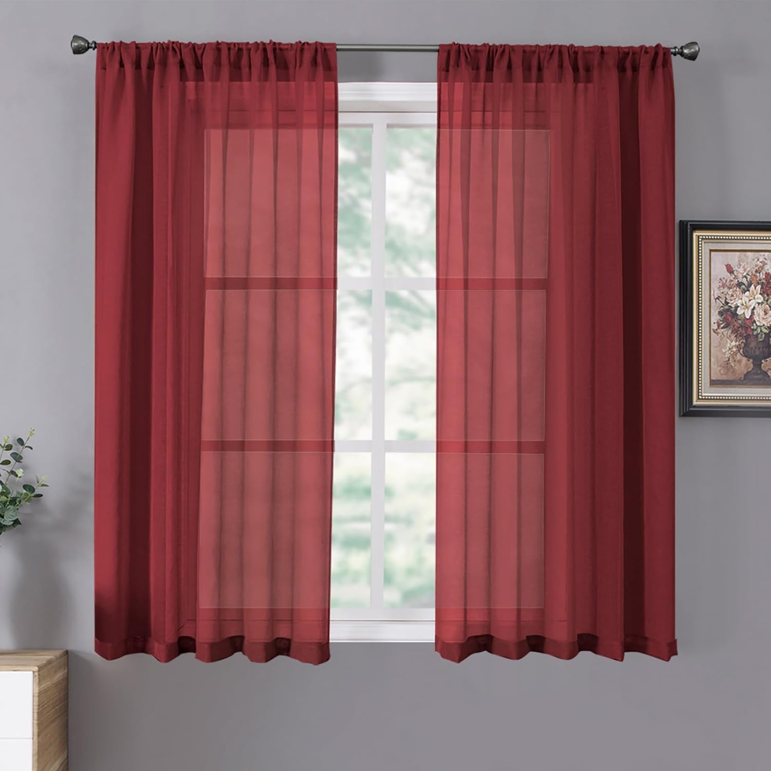 Tollpiz Short Sheer Curtain Living Room Linen Textured Curtains Sheer Light Filtering Voile Rod Pocket Curtain for Bedroom, 38 x 54 inches Long, Burgundy Red, Set of 2 Panels