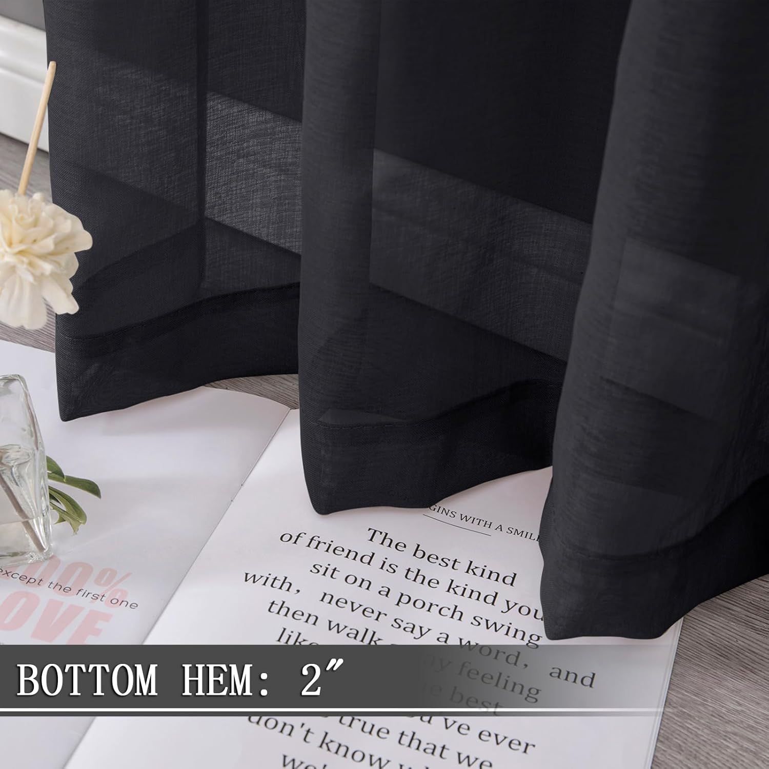 Tollpiz Short Sheer Curtain Living Room Linen Textured Curtains Sheer Light Filtering Voile Rod Pocket Curtain for Bedroom, 38 x 54 inches Long, Black, Set of 2 Panels