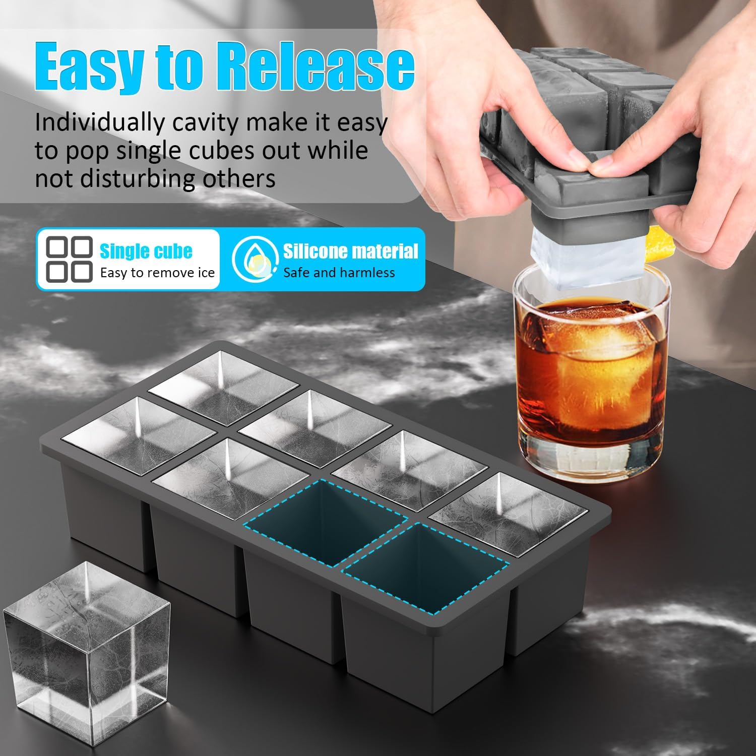 • SLOW-MELTING LARGE ICE CUBE: Ice tray make 8 square ice cubes of 2 inches at a time. The huge ice cubes will cool the drink quickly without diluting them, ensuring the original flavor of the drink. Perfect way to dress up Old Fashioned, Scotch, Bourbon, or Blended Whiskey.