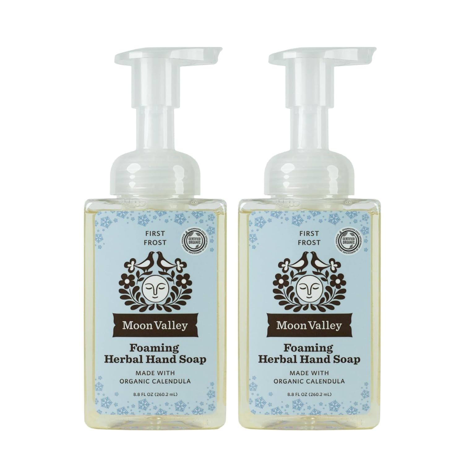 • TWO-PACK: This bundle of two 8.8oz Foaming Hand Soaps includes fresh and natural scents of First Winter Frost. Moon Valley Organics Herbal Foaming Hand Soaps are certified organic, vegan and non-gmo. Each bottle is recyclable. Ingredients leave hands soft and moisturized.