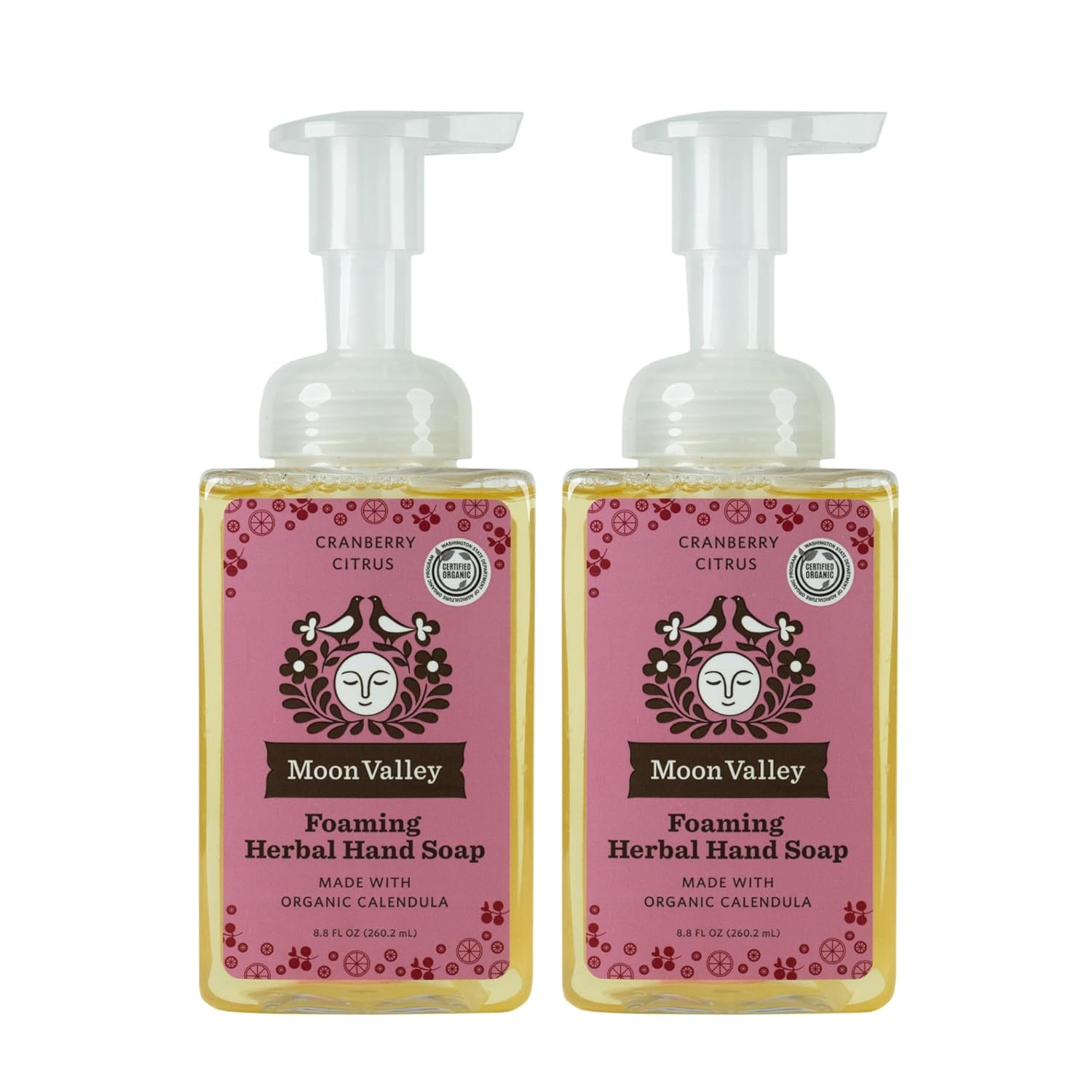 • TWO-PACK: This bundle of two 8.8oz Foaming Hand Soaps includes fresh and natural scents of Cranberry Citrus. Moon Valley Organics Herbal Foaming Hand Soaps are certified organic, vegan and non-gmo. Each bottle is recyclable. Ingredients leave hands soft and moisturized.