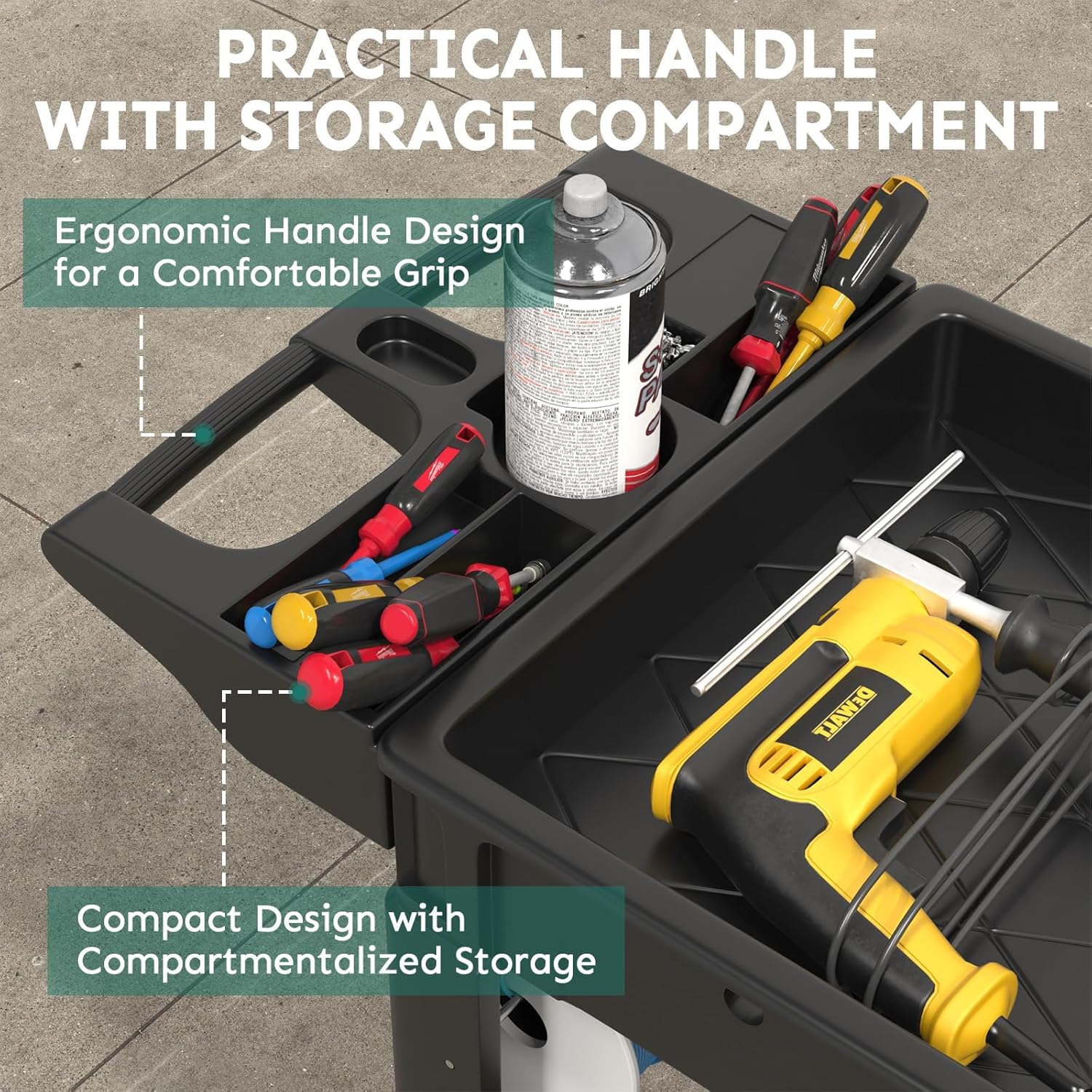 • 【Portable Design】Plastic utility service carts are equipped with ergonomic armrests that allow you to move with less effort and experience a comfortable grip. Modular storage compartments and small holes are designed to keep your tools handy and enhance your experience.