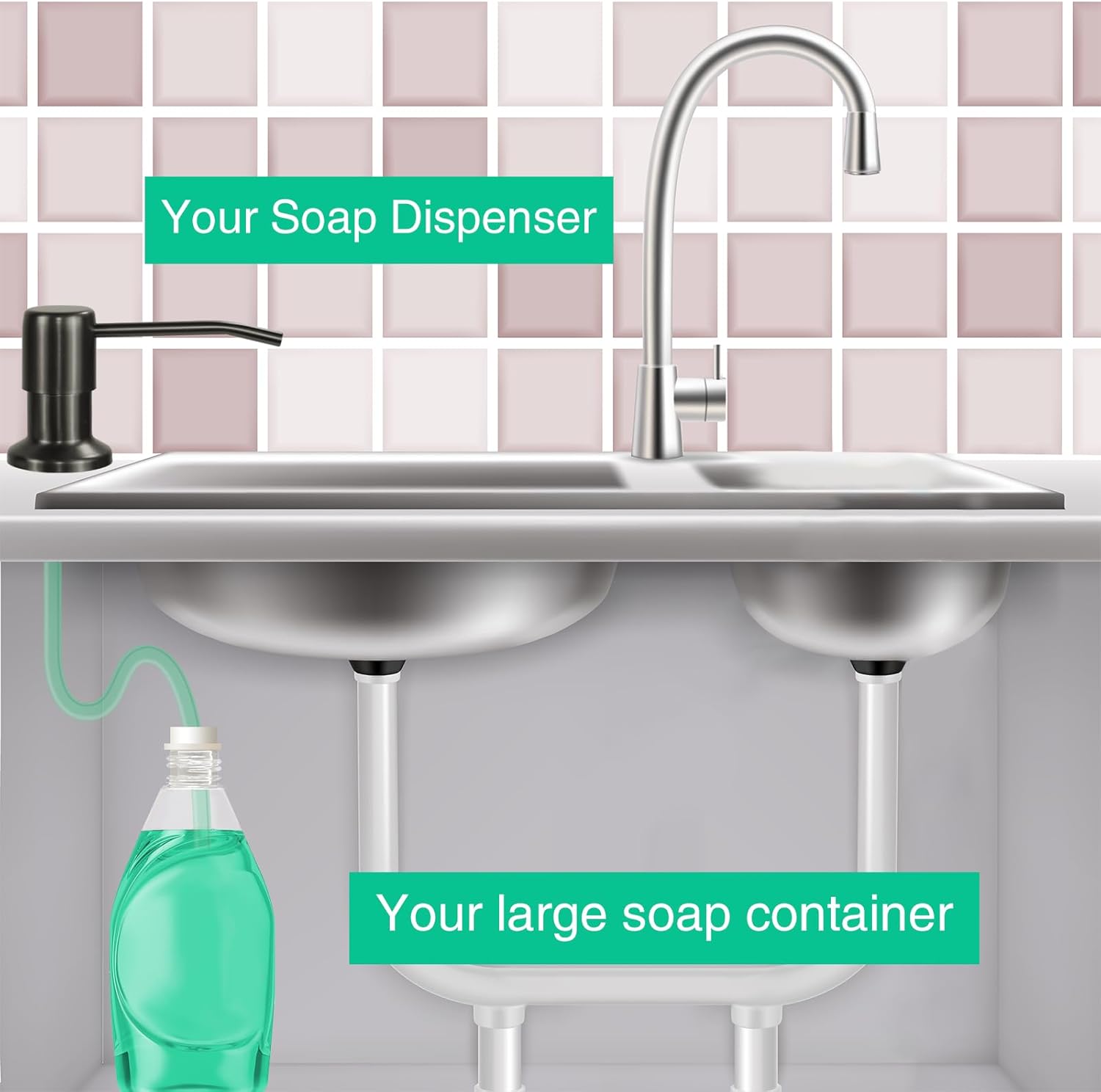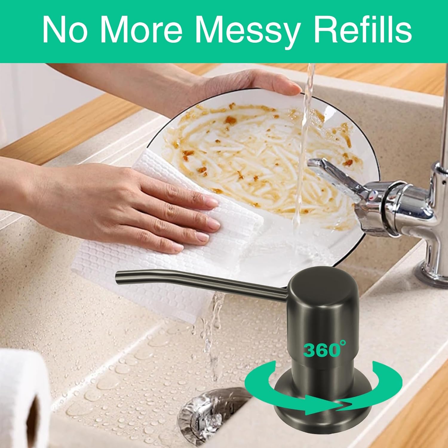 • No more messy refills - No more crawling under the sink. Our elegant sink soap dispenser comes with a 47” tube that goes directly into a large dish soap bottle, you can skip the frequent refill process.