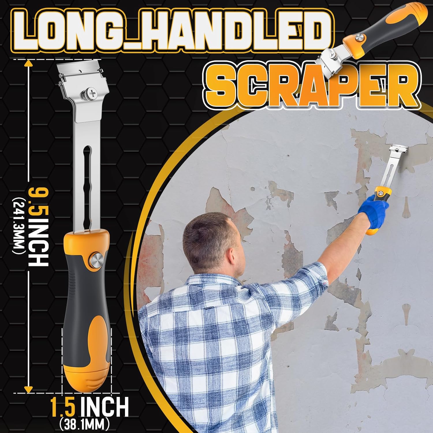 • VERSATILITY FOR ALL TASKS - Our razor blade scraper set is designed to handle a wide range of cleaning and DIY tasks effortlessly. It includes a long-handle scraper for large surfaces and high-reaching tasks, and a short-handle scraper for precise work, ensuring accurate removal of dirt, stickers, adhensive.