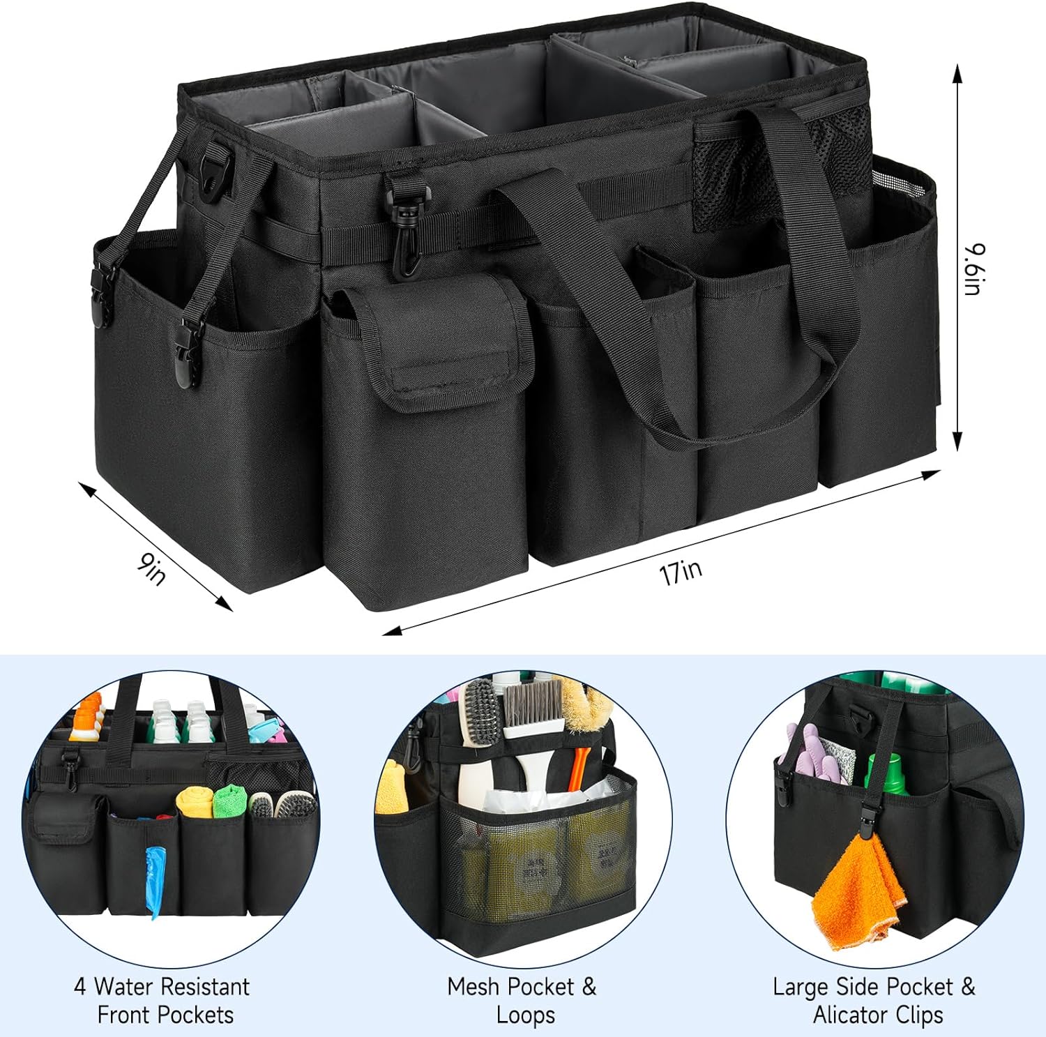• Removable Padded Cushion: Unlike other fixed compartments, this cleaning caddy for cleaning supplies is designed with removable padded divider, which can help you use the space widely and make your items well-organized