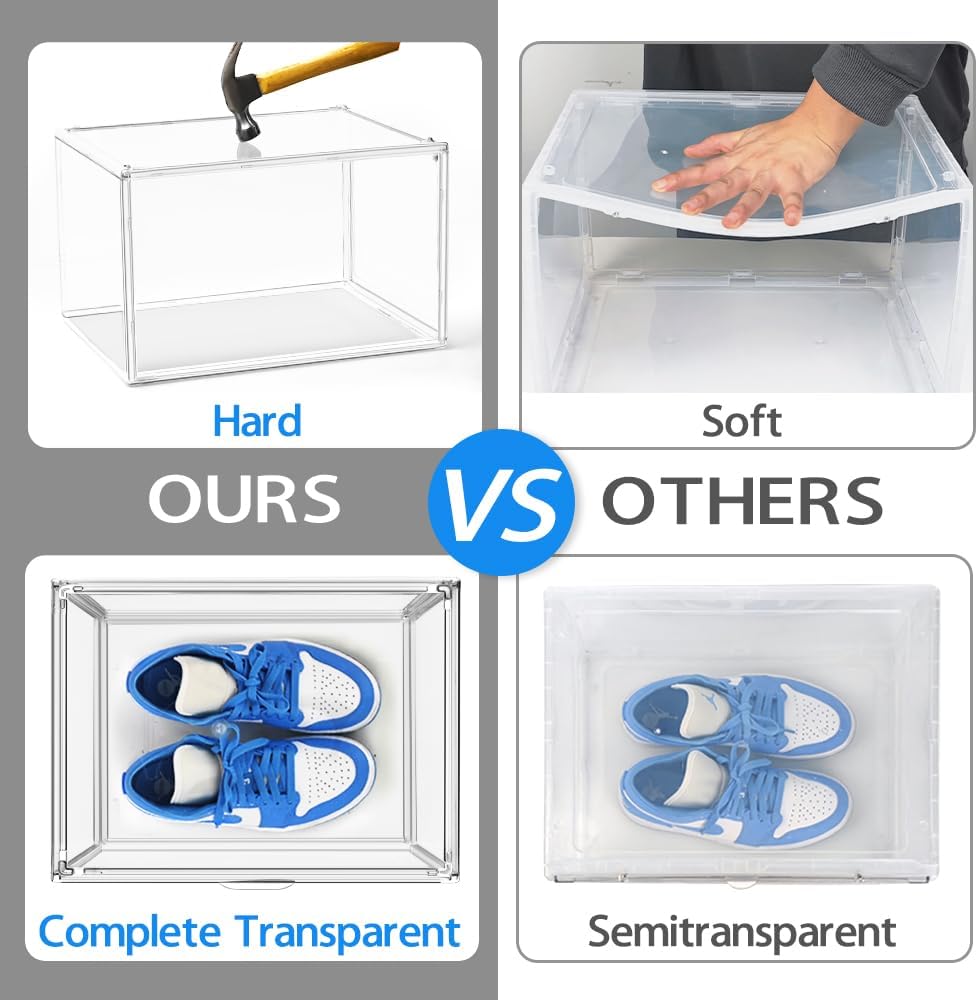 • 【Fit Your High-Tops】: Each shoe crate measures 14.1" L x 10.6" W x 8.9" H, providing ample space for up to size 15 women's shoes or size 14 men's shoes. The sturdy construction, made of thick high-hardness PET acrylic panels, ensures that your high-tops, sneakers, and boots are securely stored. Reliable