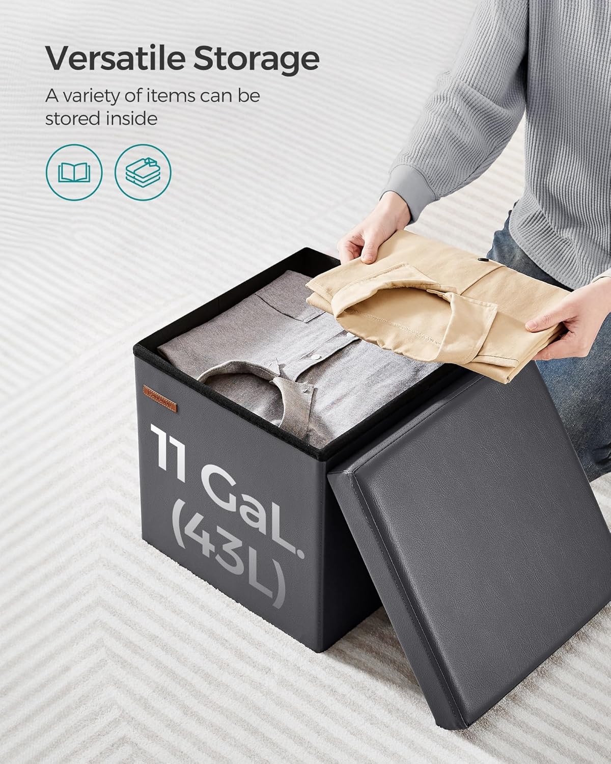 SONGMICS Mazie Collection - 15 Inches Ottoman with Storage, Footstool, Storage Ottoman, Load 660 lb, for Dorm, Living Room, Bedroom, Synthetic Leather, Dark Gray ULSF010G01