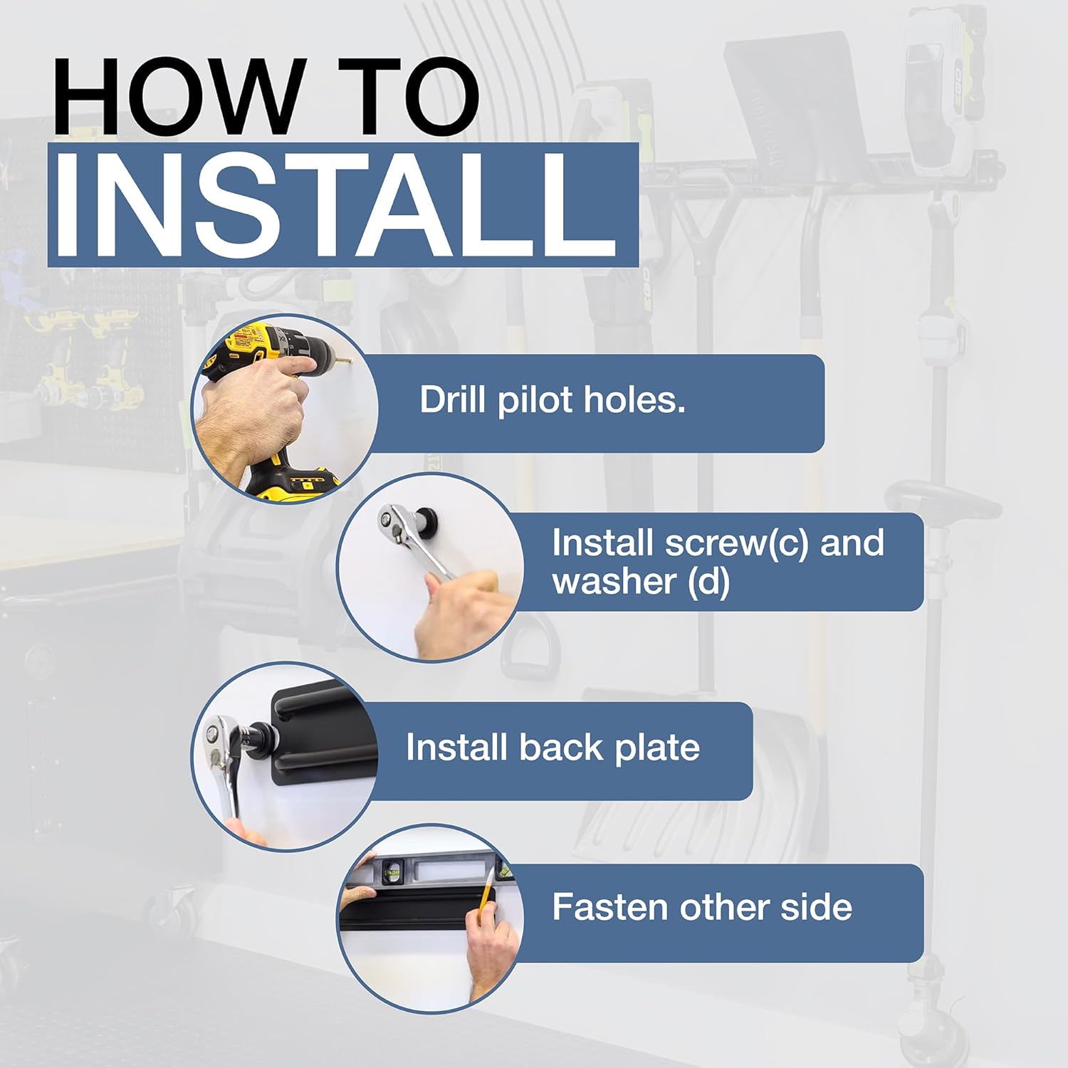 • EASY TO INSTALL & USE – This mop and broom holder wall mount installs directly into standard wall studs for secure hanging storage. Includes all hardware for a quick setup, making it simple to organize your garage shelving wall, shed organizer, or garage storage cabinet.