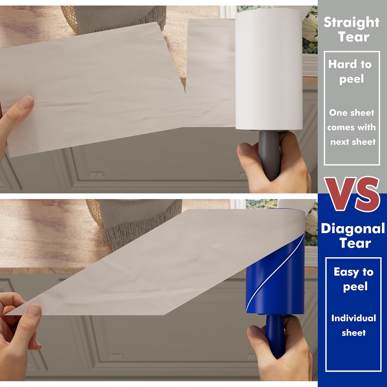 • Easy To Tear: The lint roller papers take new upgraded design, the paper sheet has two color which one layer is white and another is blue. You can easily find where to peel off.