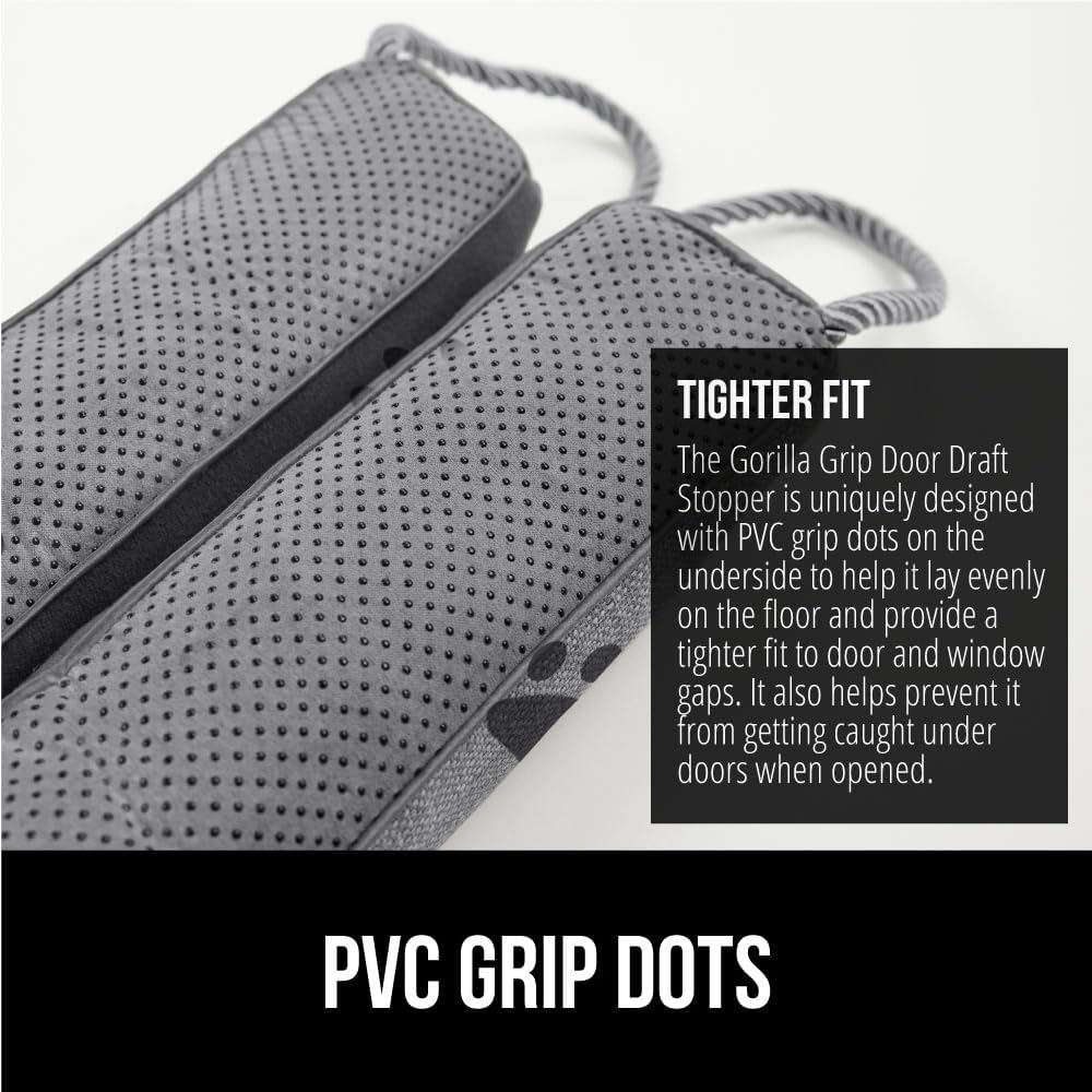• STAY IN PLACE GRIP DOTS: uniquely designed with PVC grip dots on the underside to help stopper lay evenly on the floor and provide a tighter fit to door or window gaps; grip dots help prevent curling and keep stopper from getting caught under doors when opened; please install with grip dots on the floor