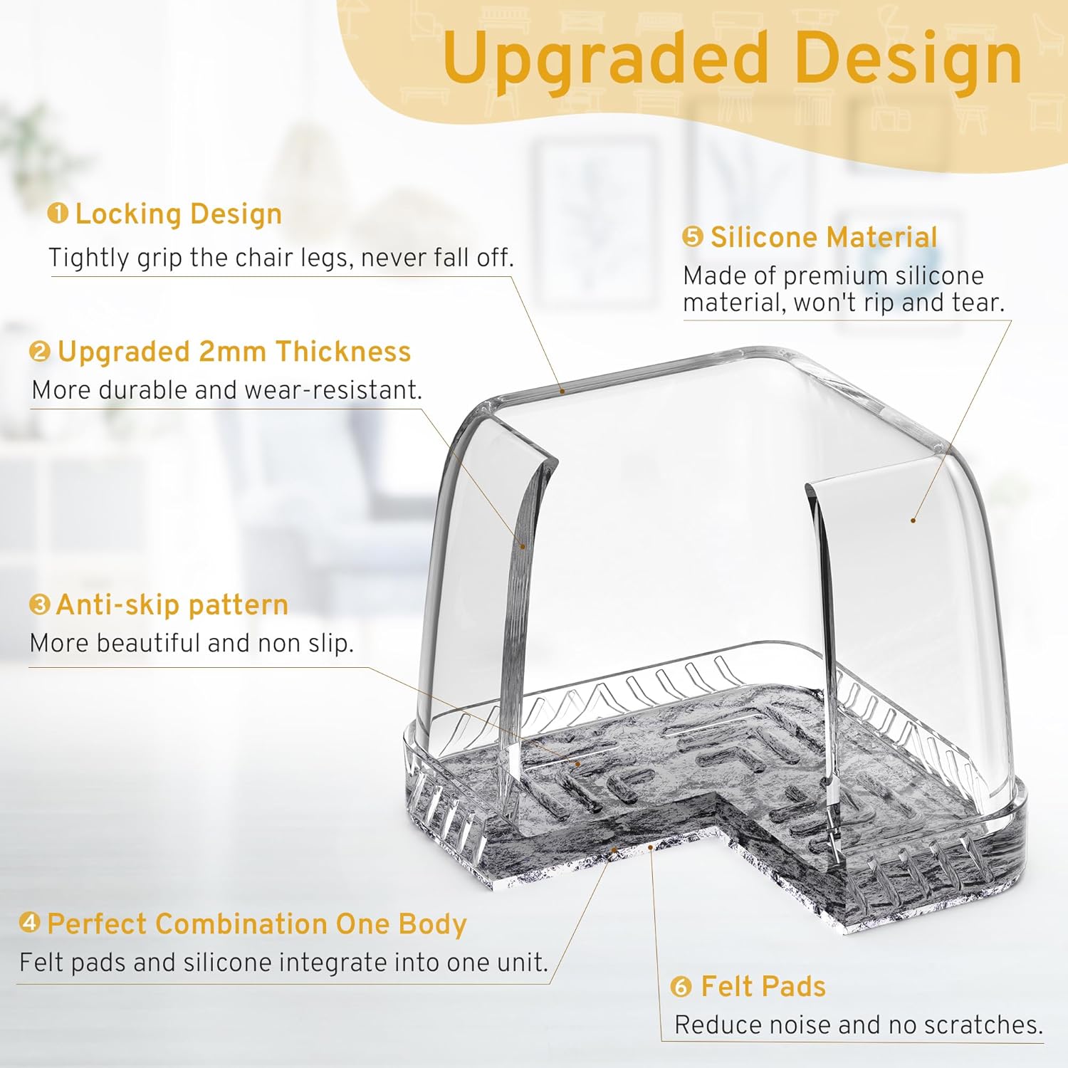 • ✅【Premium Quality Material】We would like to offer top-tier quality chair leg floor protectors at the most reasonable price. So we choose the premium quality silicone material. Our floor protectors for chairs are more clear and have higher thickness than most chair leg covers on the market, which are more durable and flexible, ensuring the floor protectors won't tear when stretched.