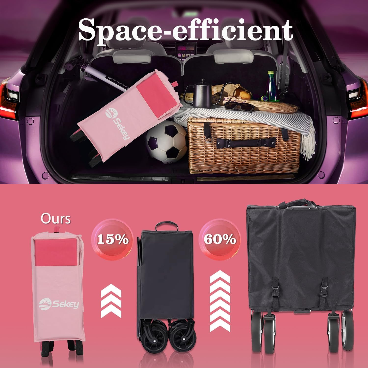 Sekey 220L Collapsible Foldable Wagon with 330lbs Weight Capacity, Heavy Duty Folding Wagon Cart with Big All-Terrain Wheels & Drink Holders (Pink)