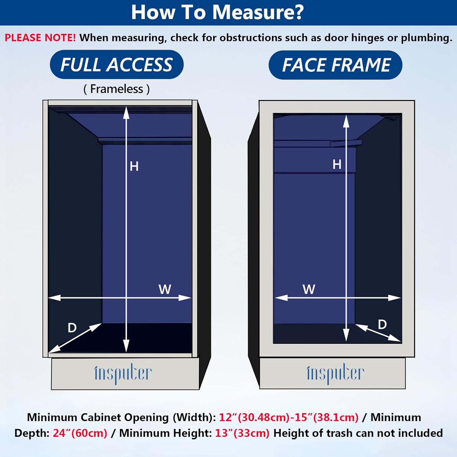 • Space Saving: Say goodbye to unsightly trash cans taking up valuable kitchen space! The Insputer cabinet trash can pull out kit fits perfectly underneath cabinets, making it easy to hide recycling and garbage storage in the cabinets, preventing odors from emanating from your trash, and maximizing every inch of storage space in your kitchen. (Note: When used under the sink, you need to pay attention to the obstruction space of the downspout)