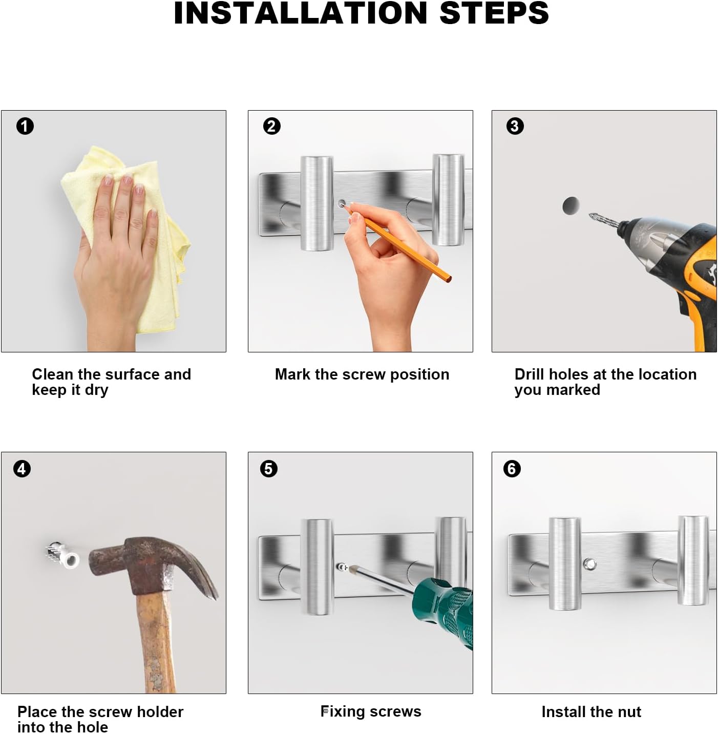 • VERSATILE USE:This Silvery Row Hook Coat Rack with 5 Hooks is good for various locations, including bathrooms, kitchens, living rooms, entrances, and offices. Use it to hang towels, kitchenware, coats, hats, jackets, wallets, keys, and more, adding functionality and organization to your space