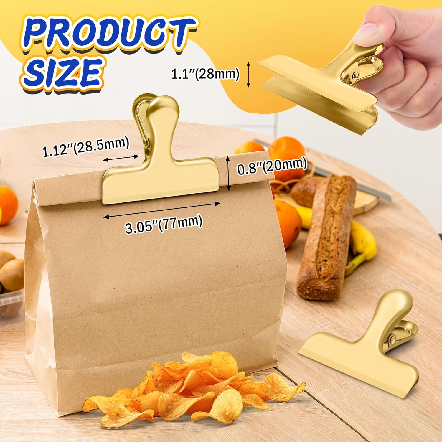 VNDUEEY 12 Pack Chip Clips, Stainless Steel Bag Clips for Food - Keep Snacks Fresh, Strong Grip Chip Clip Bag Clip, Perfect for Kitchen and Office Supplies -3 Inches, Gold