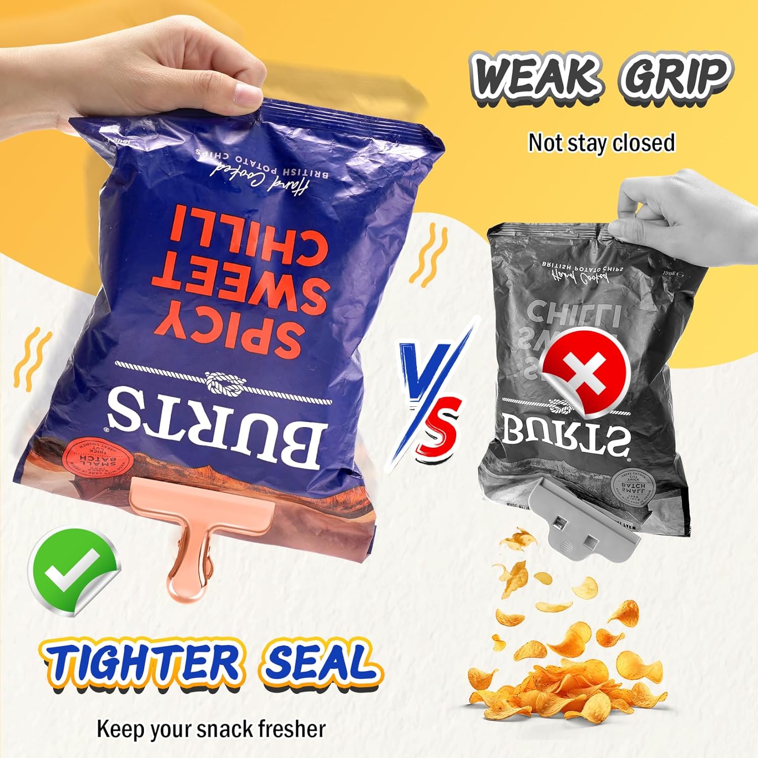 • 【Secure Seal】Made from stainless steel, including the spring, these chip bag clips ensure a tight seal for various bags, from snacks to frozen vegetables.