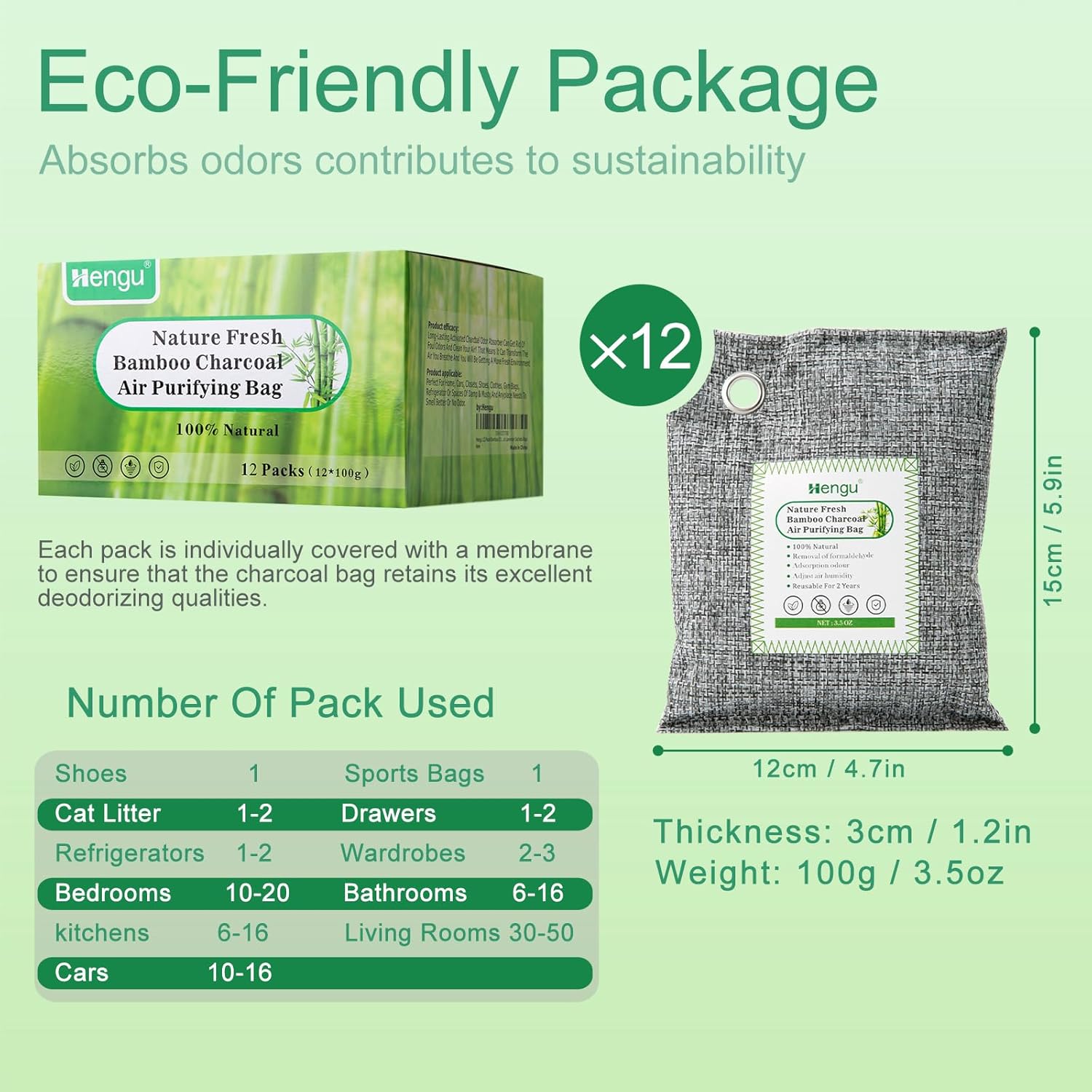 • 【12-Pack Activated Charcoal Odor Absorber】Our activated charcoal odor absorber has richer porous structure and organic composition,which could remove & adsorb unpleasant odors,Makes your home fresh.You can hang them with the rope anywhere in your house. 3.5 ounce /100g each bag, 4.7" x 5.9".
