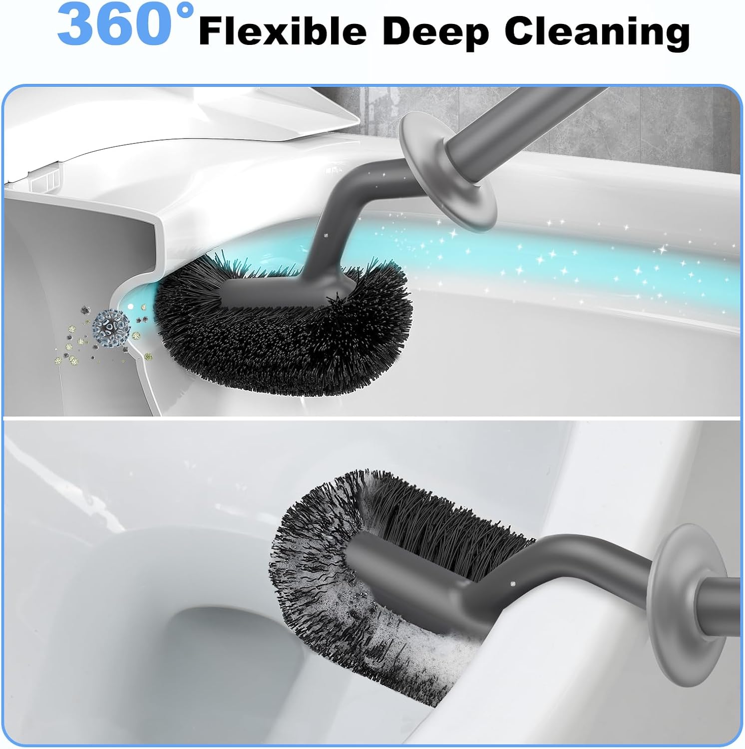 • [CURVED DESIGN SCRUBBER] The toilet bowl brush and holder has a specially S-shaped design that easily reach hard-to-clean areas,it can get up under the rim of the and down to the hole. The brush bristles are very flexible and durable to and debris without hurting the glaze. It's ideal for keeping the bowl clean and fresh.