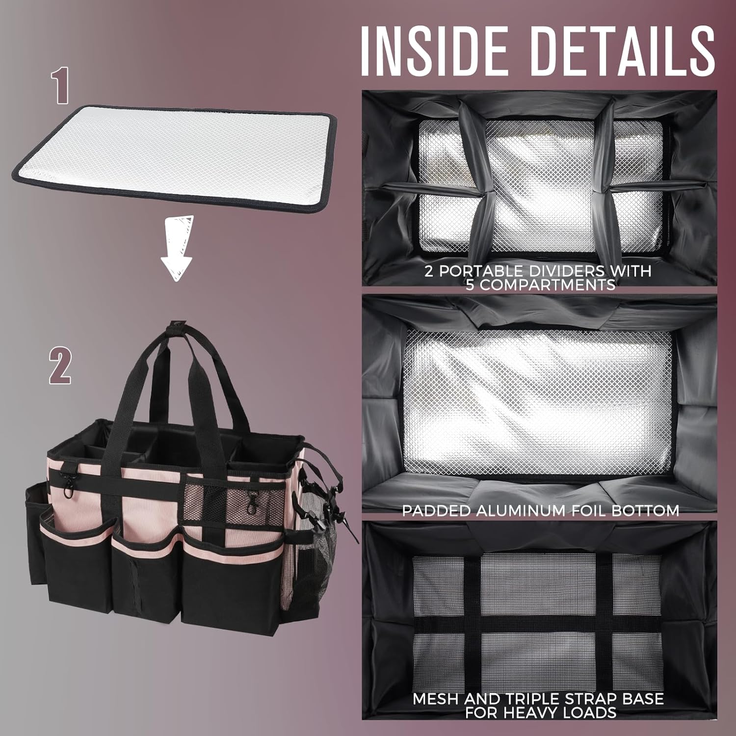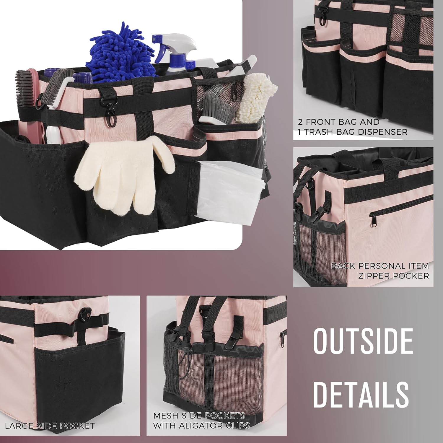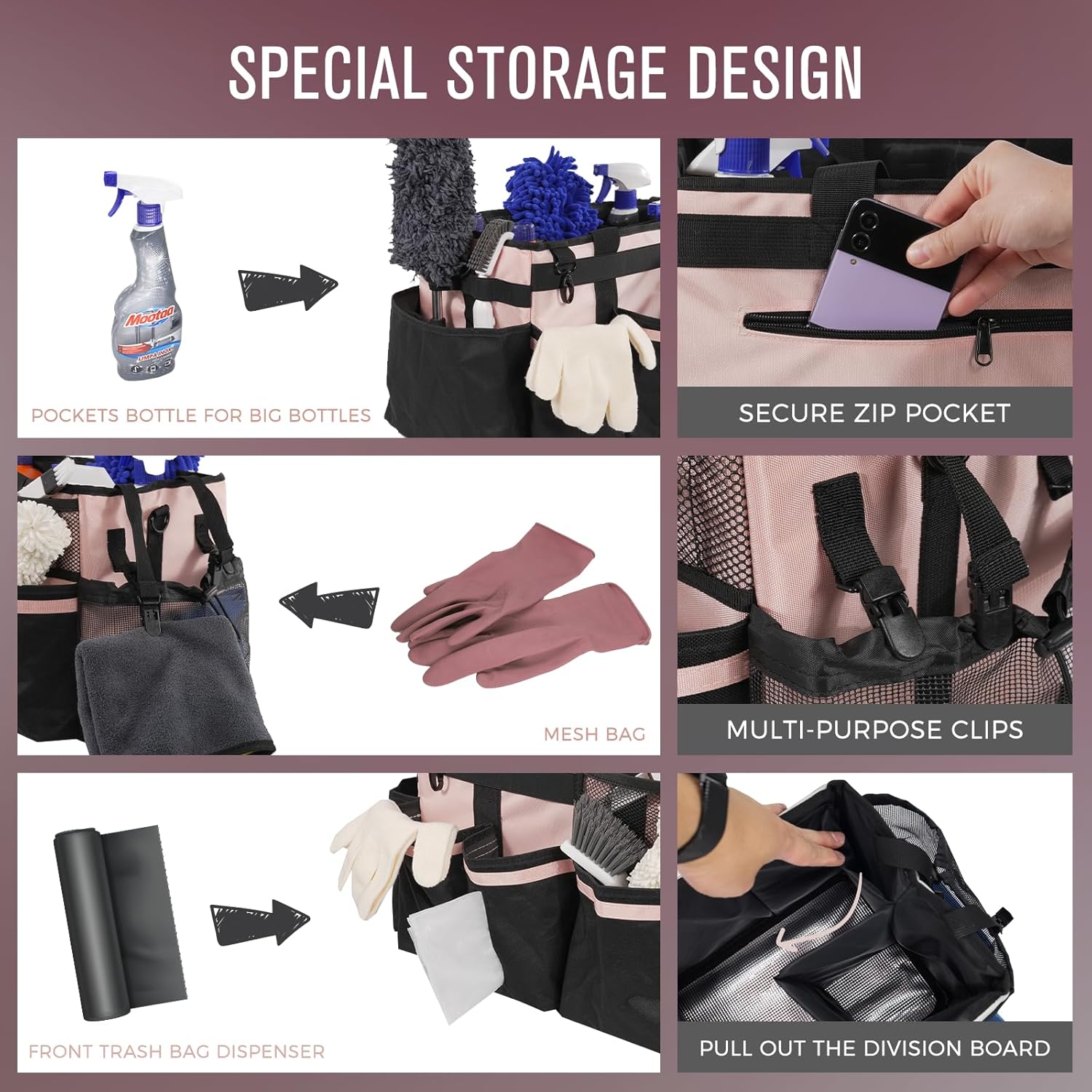 Wearable Cleaning Caddy, Cleaning Caddy Supplies Organizer with Handle & Shoulder Straps for Housekeepers, Under Sink & Car Cleaning Tool Organizers Bag with 4 Foldable Divider (Pink)