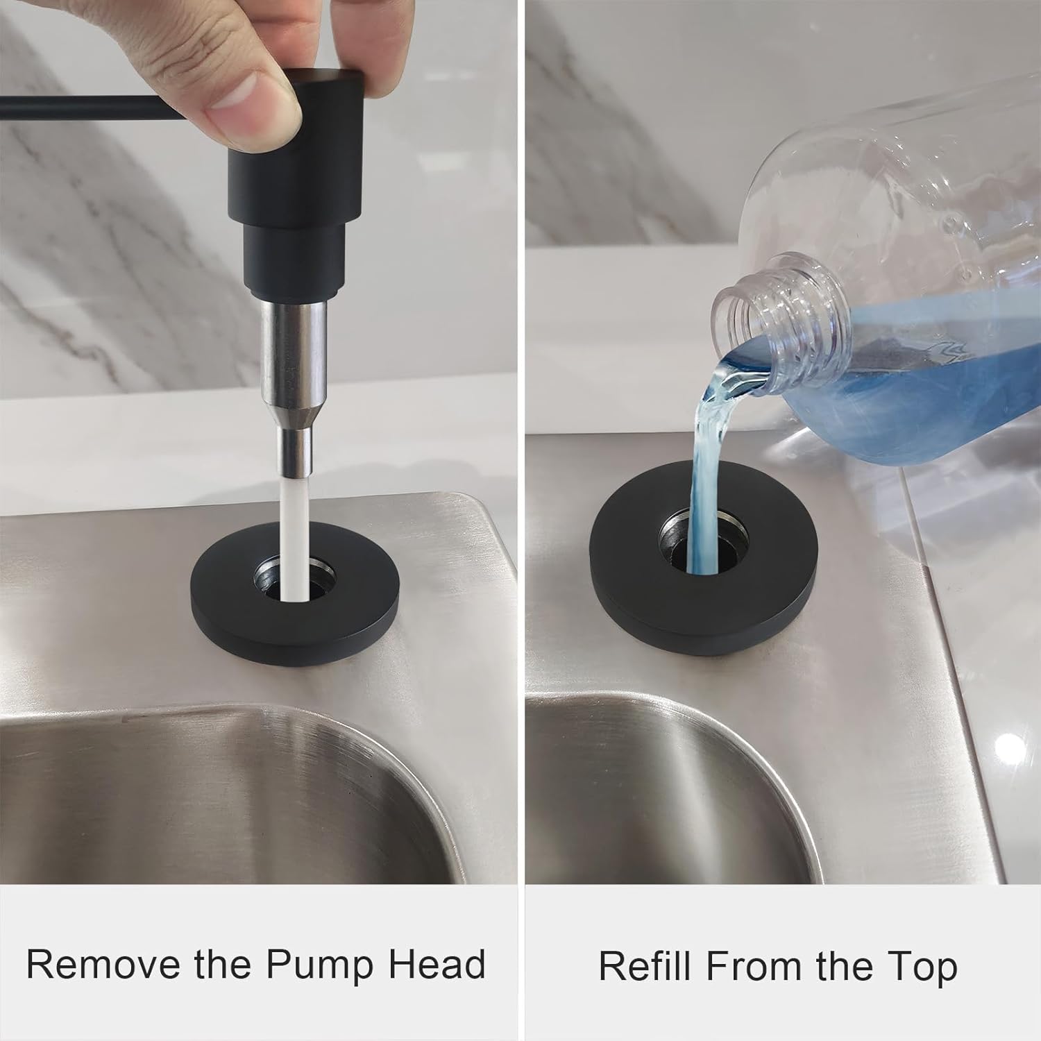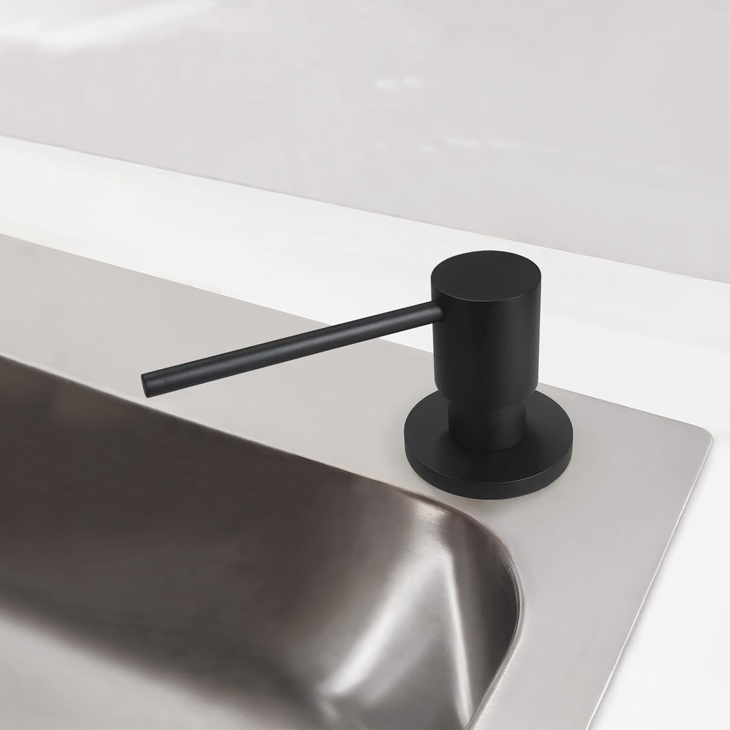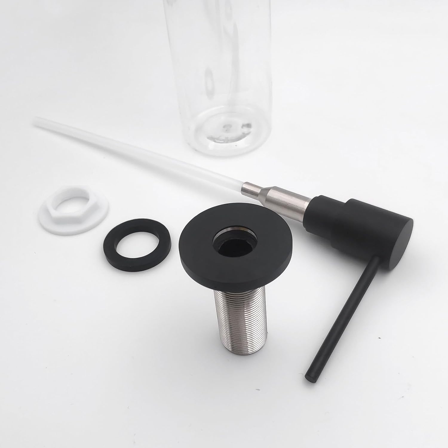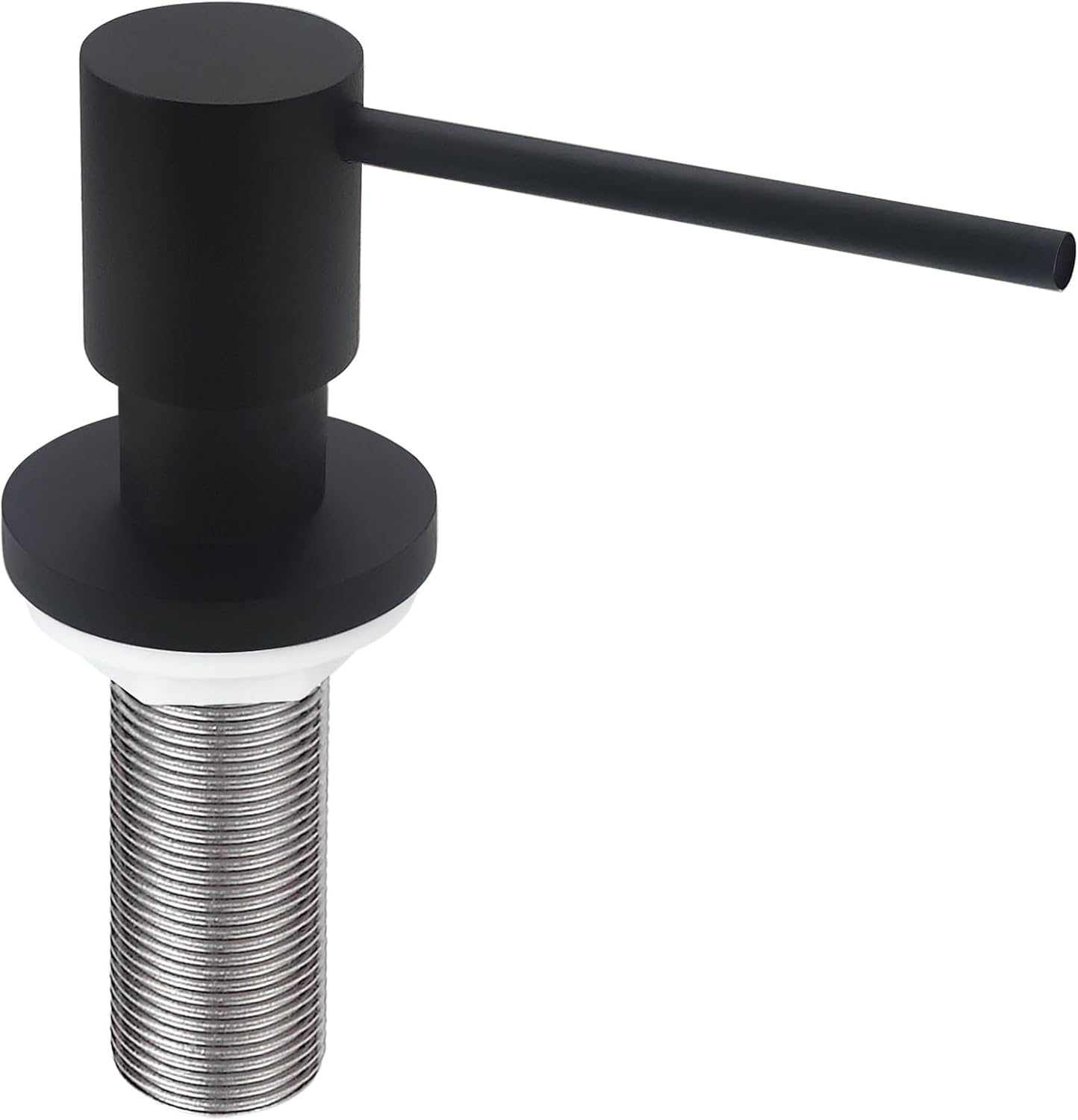 • Built To Last:Sturdy built in sink soap dispenser for kitchen sink,pump head, pump core and threaded tube are made with solid brass, equiped with corrosion resistant spring. It comes with a 17 OZ large plastic bottle. SOLID BRASS CONSTRUCTION Matte black rust resistant finish that will not tarnish as time goes on. The heavy soap dispenser pump mechanism is designed for long lasting excellent performance to dispense consistently with each and every press. Matching perfectly with most faucet models from different brands.