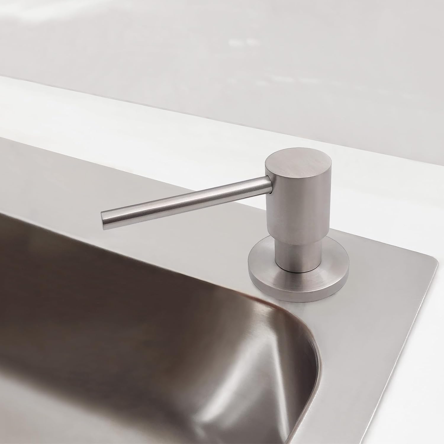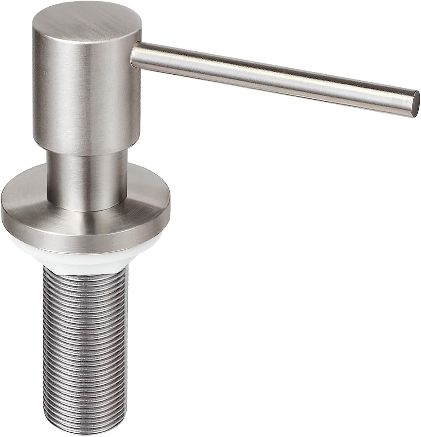 • ️Built To Last:Sturdy built in sink soap dispenser for kitchen sink,pump head, pump core and threaded tube are made with solid brass, equiped with corrosion resistant spring. It comes with a 17 OZ large plastic bottle. SOLID BRASS CONSTRUCTION brushed nickel rust resistant finish that will not tarnish as time goes on. The heavy soap dispenser pump mechanism is designed for long lasting excellent performance to dispense consistently with each and every press. Matching perfectly with most faucet models from different brands.