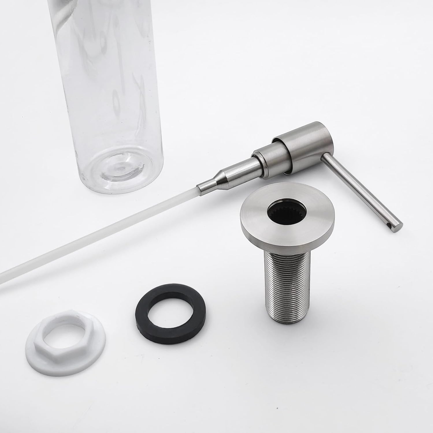 • Package Contents: 1 PET empty bottle, 1 Brushed Nickel Brass pump-head, 1 Washer, 1 Lock nut.