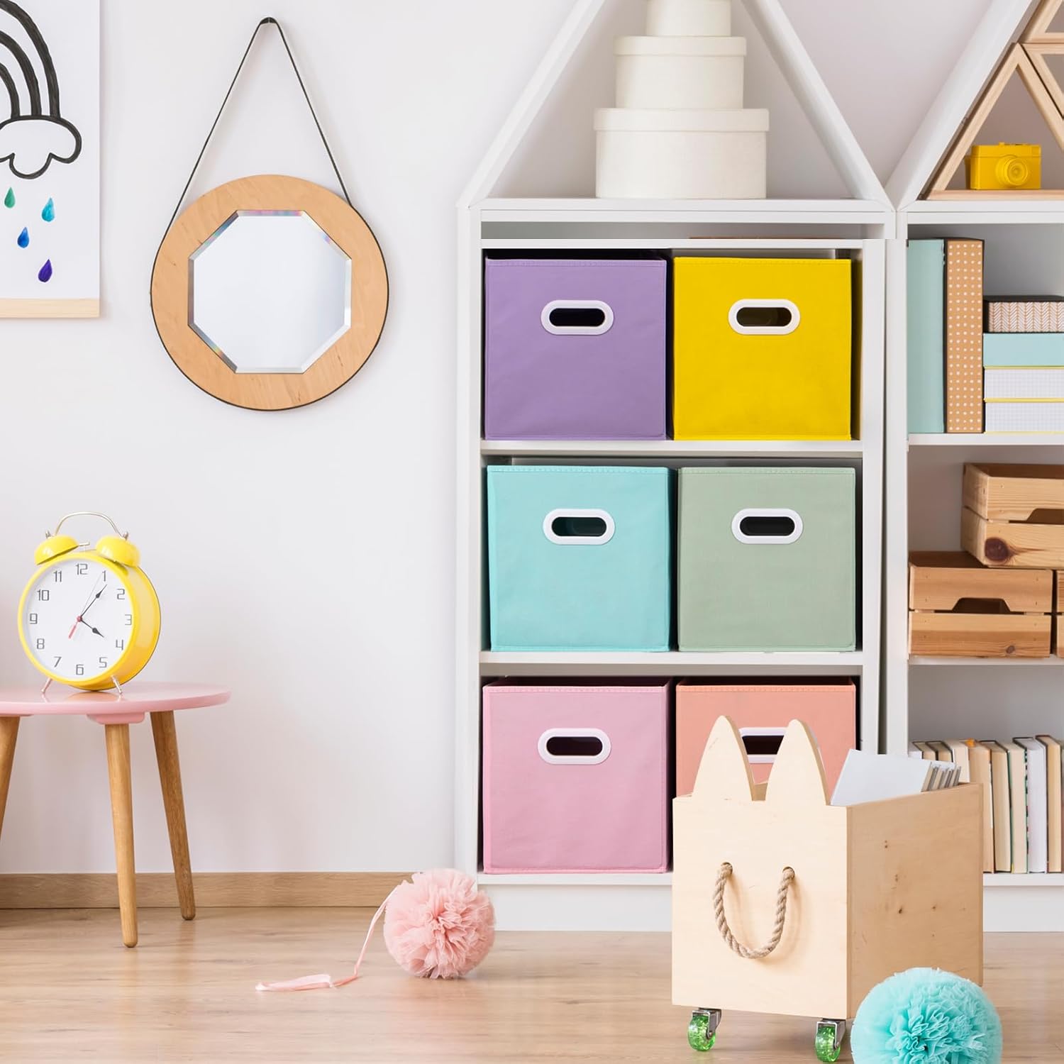 Stero Fabric Storage Cubes Bins, 11 inch Fun Colored Foldable Storage Baskets with Dual Plastic Handle for Home, Kids Room, Closet and Toys Organization, Multi Colored, Set of 6