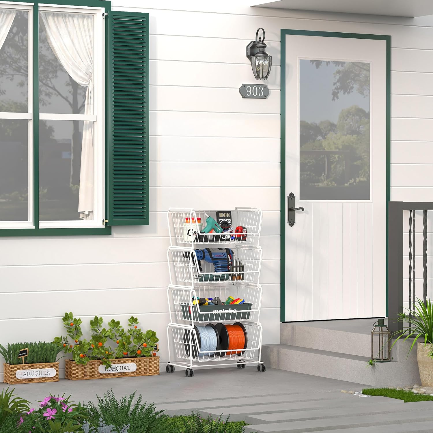 • 【Suitable Capacity】Each individual basket size: L17''x W11.5''x H8'', 4 tier storage rack set (wheels included) size: L17''x W11.5''x H31.6''. Enough space with open design, this metal storage basket rack allows for visible storaging, convenient for sorting, you can put in or find out your item very easy in the basket. A perfect storage/space save solution for your home, kitchen, pantry closet, bedroom, bathroom, office, laundry rooms, craft rooms, playrooms garage and so on