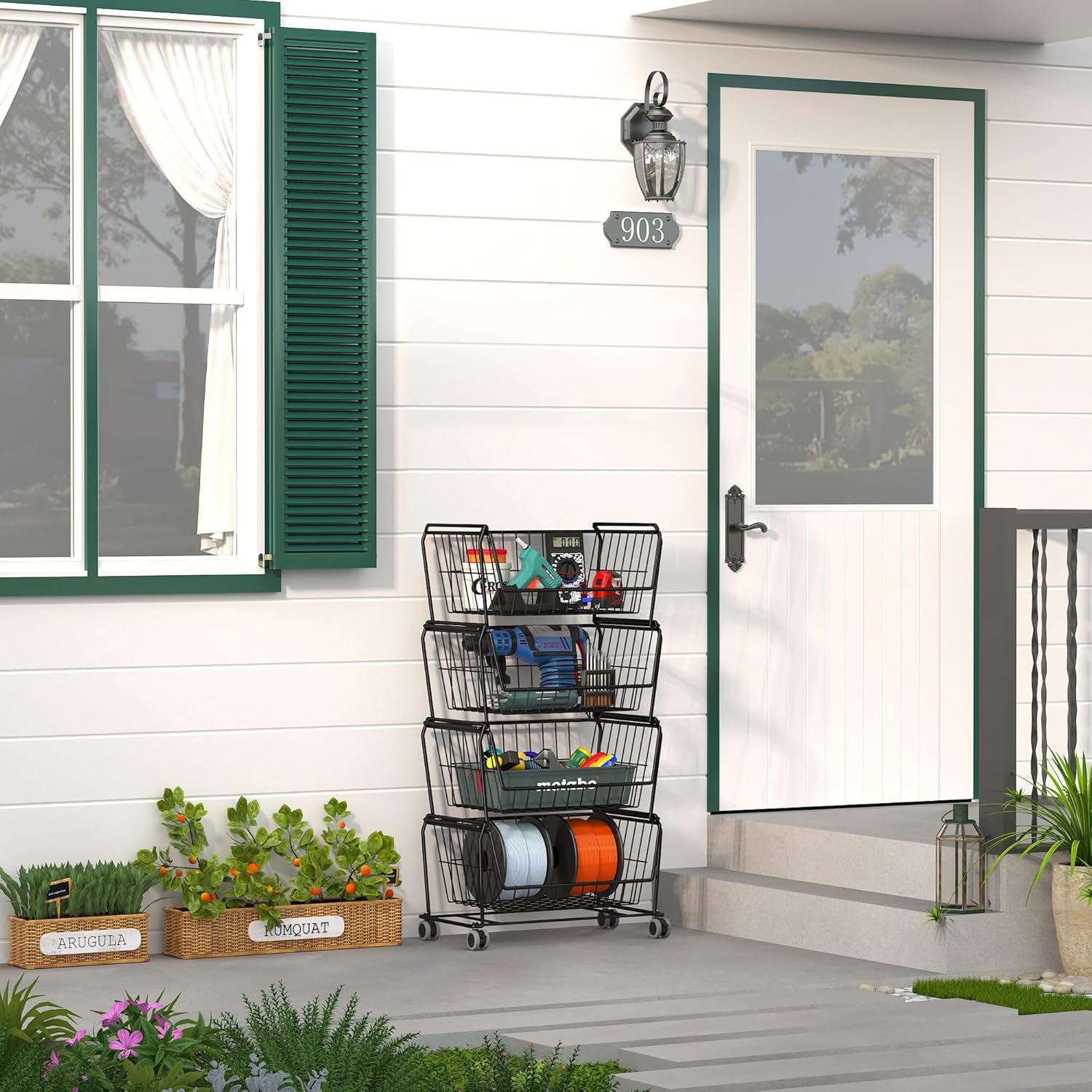 • 【Suitable Capacity】Each individual basket size: L17''x W11.5''x H8'', 4 tier storage rack set (wheels included) size: L17''x W11.5''x H31.6''. Enough space with open design, this metal storage basket rack allows for visible storaging, convenient for sorting, you can put in or find out your item very easy in the basket. A perfect storage/space save solution for your home, kitchen, pantry closet, bedroom, bathroom, office, laundry rooms, craft rooms, playrooms garage and so on
