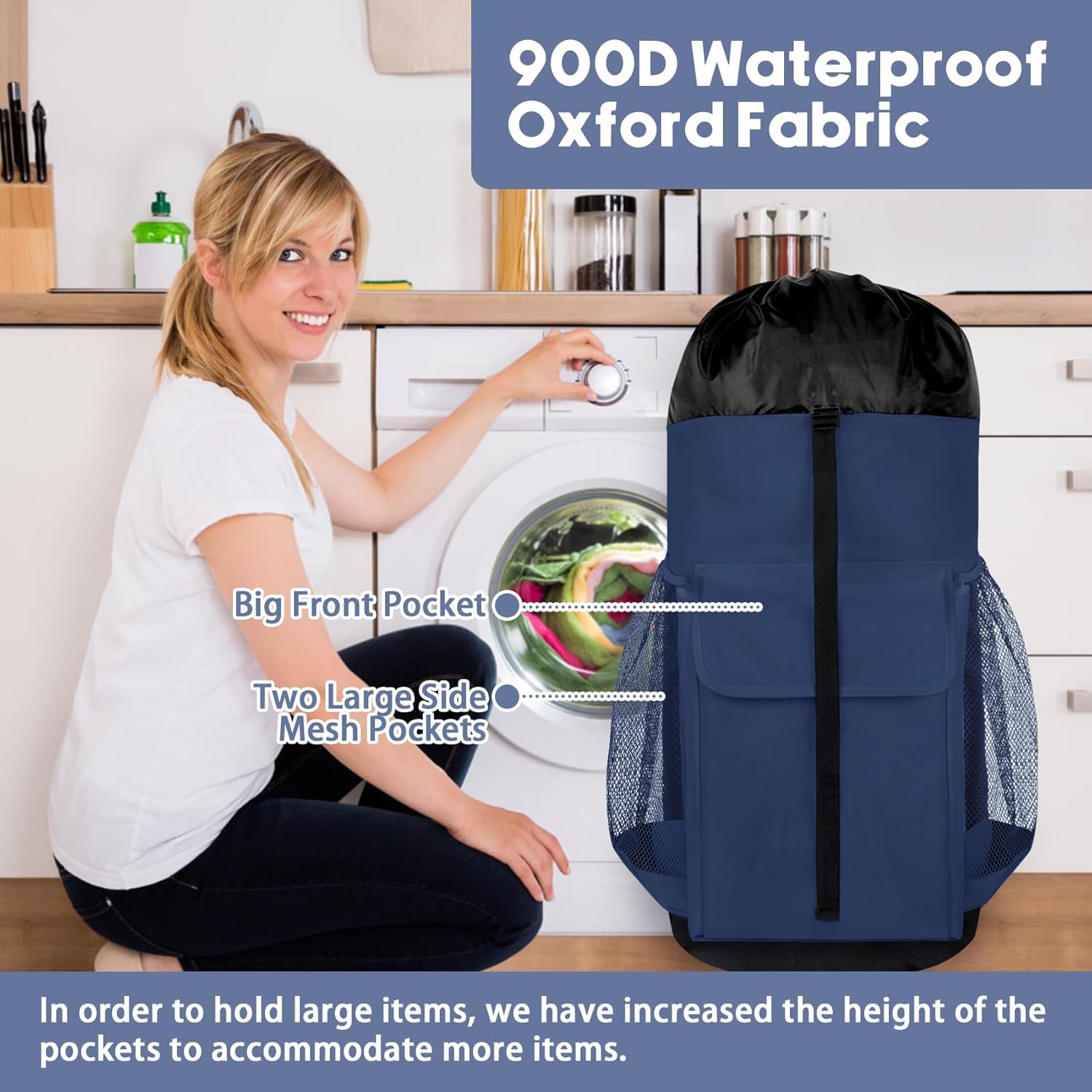 Laundry Backpack Bag, 132L Extra Large Heavy Duty Laundry Backpack for College Dorm Essentials, Laundry Hamper Travel Bag with Shoulder Straps and Mesh Wash Bags for Laundromat, Apartment Blue